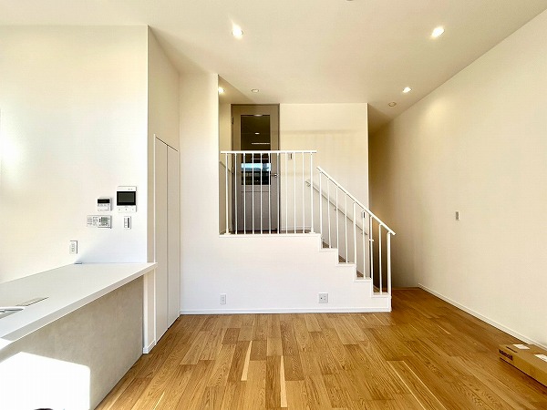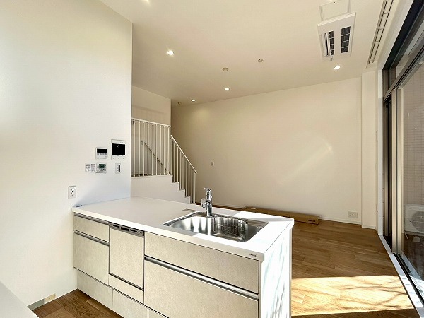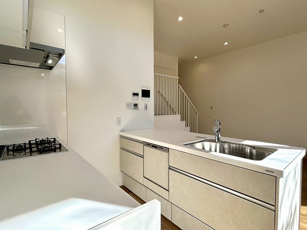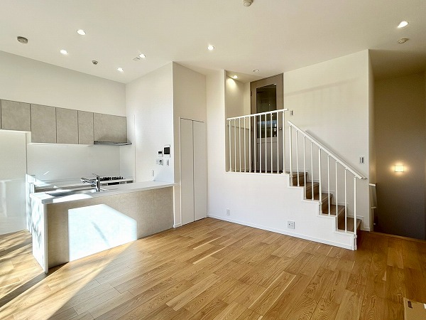 約15.1帖のリビングダイニングキッチンは階段を下った先にあります。天井が高くかなり広々とした印象を感じました。リビングダイニング部分には床暖房があり、寒い日でも足元から体を温めてくれますよ。
