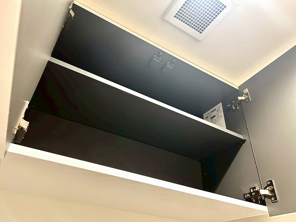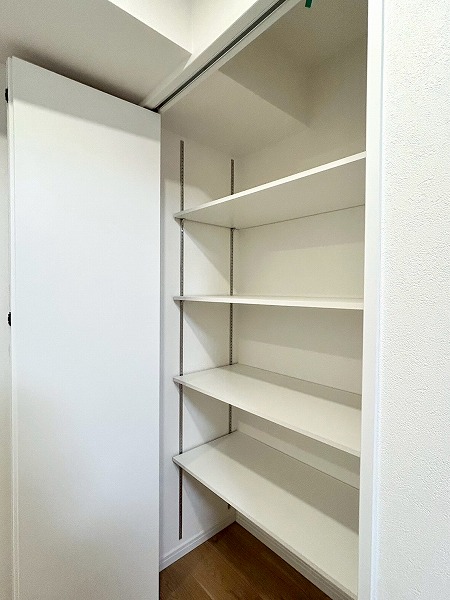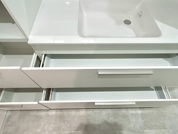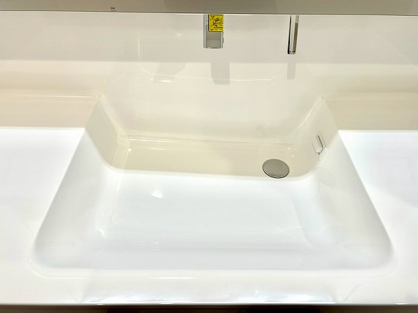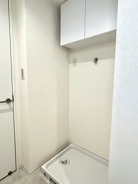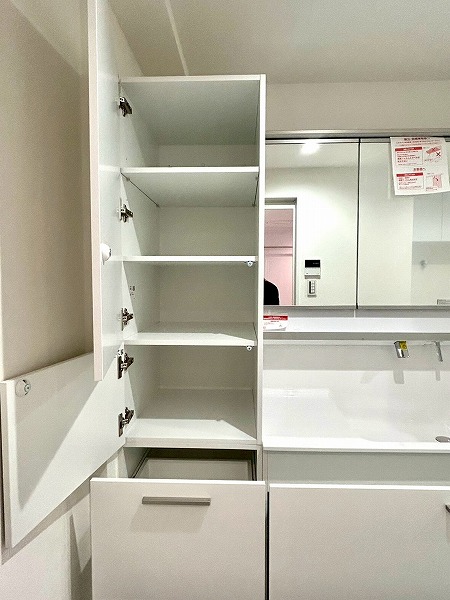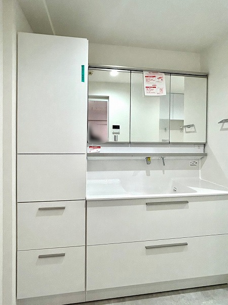 洗面化粧台、洗濯機置き場、バスルームが一緒になったパウダールームは白を基調とした内装で、清潔感を感じられます。3面鏡の付いた化粧洗面台は収納豊富で、生活用品をたくさん収納できるのでスッキリとした印象を保てそう✧