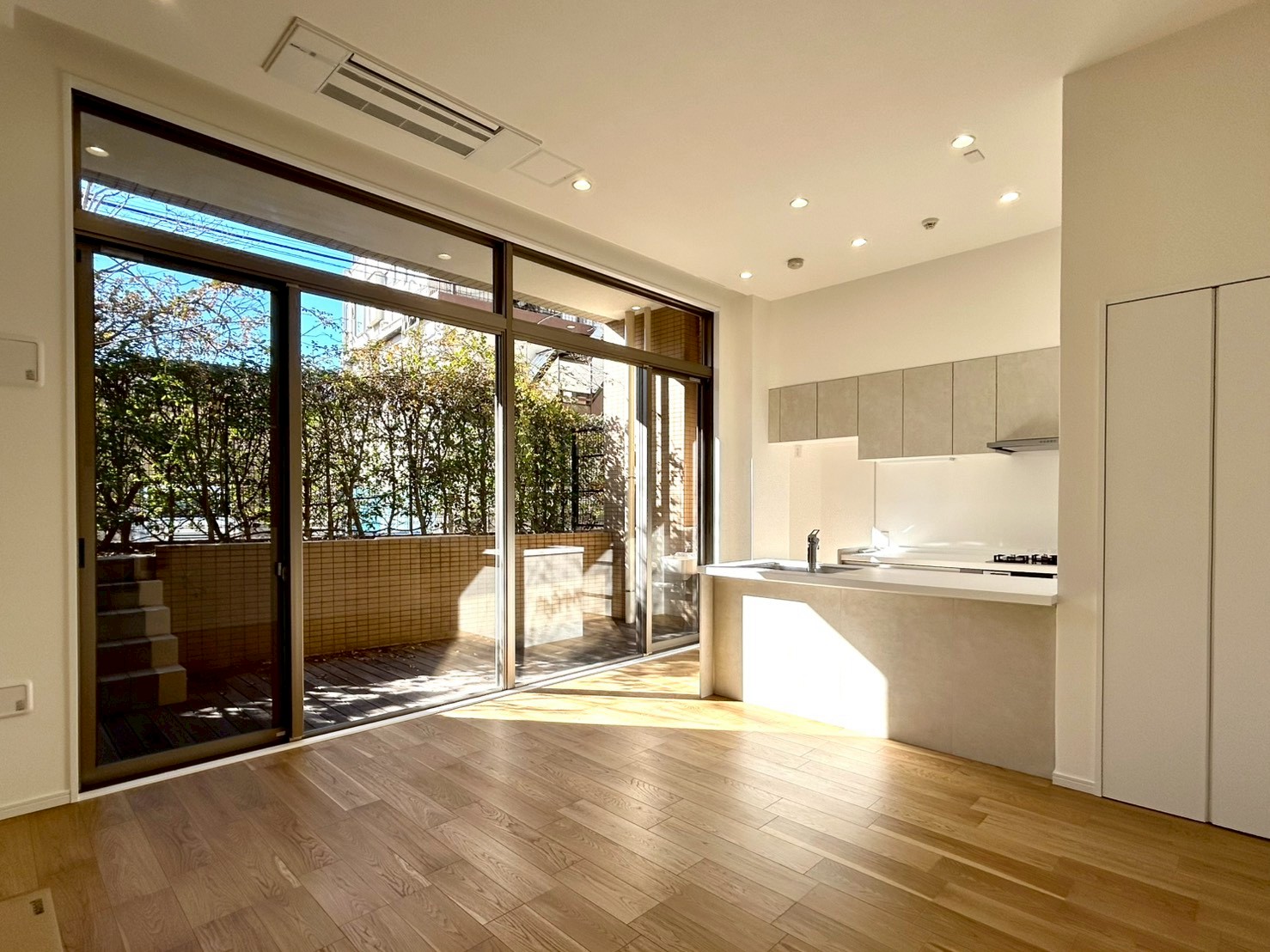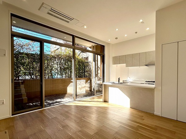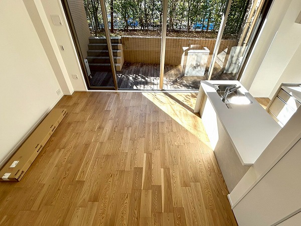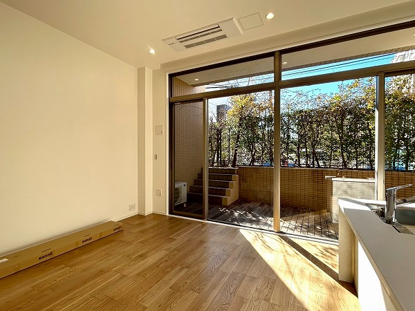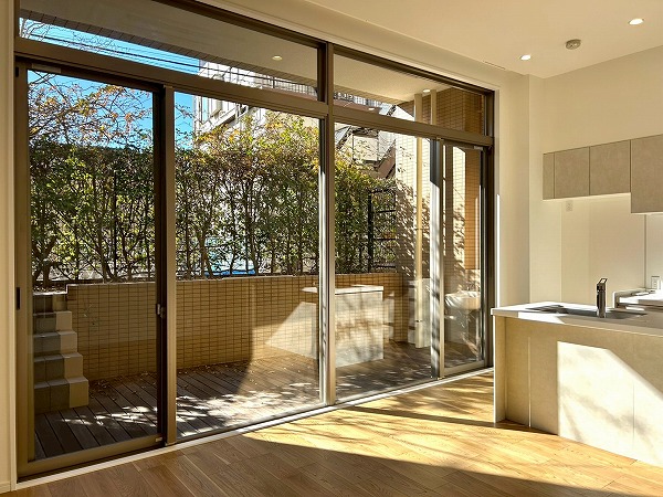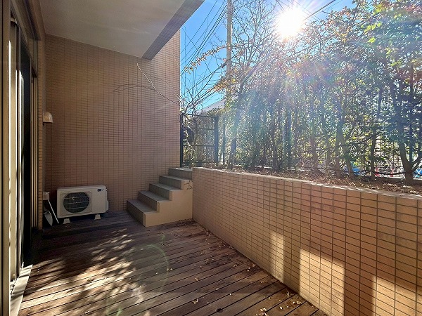 大きな専用庭付きのテラスは陽当たりが良く、洗濯物も良く乾きそう。テーブルや椅子を置けばくつろぎ空間にもなりそうですね。木々が生えている為、自然を身近に感じられ、目の前の道路からの視線も遮れる仕組み。