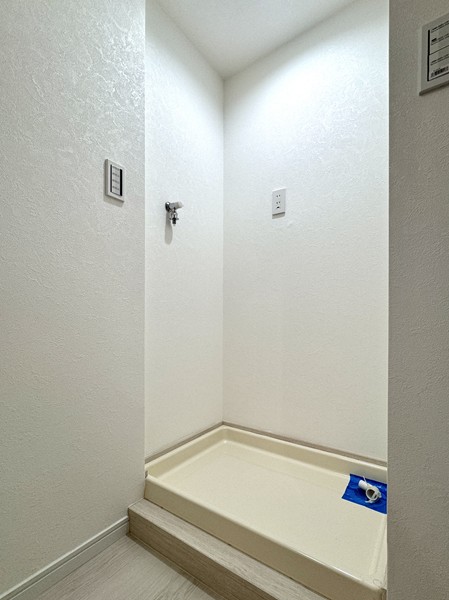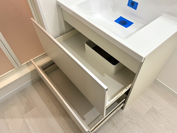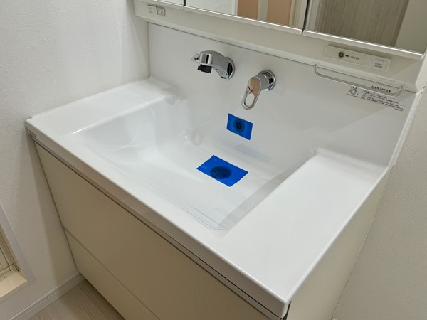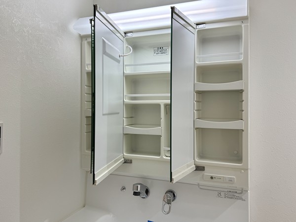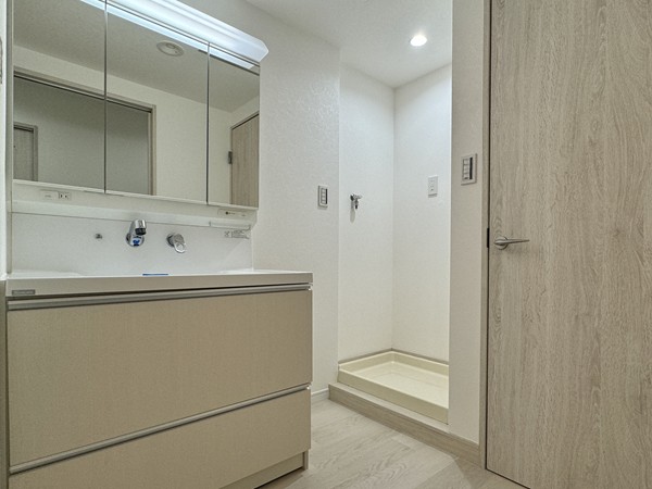 水回りが集結したサニタリールーム。家事を効率良くこなすことが出来そうです。洗面化粧台には、合わせ鏡としてもご利用いただける3面のミラーキャビネットを採用。洗面用品やスキンケア用品を収納するのにもピッタリですよ◎
