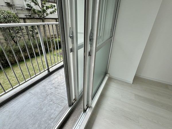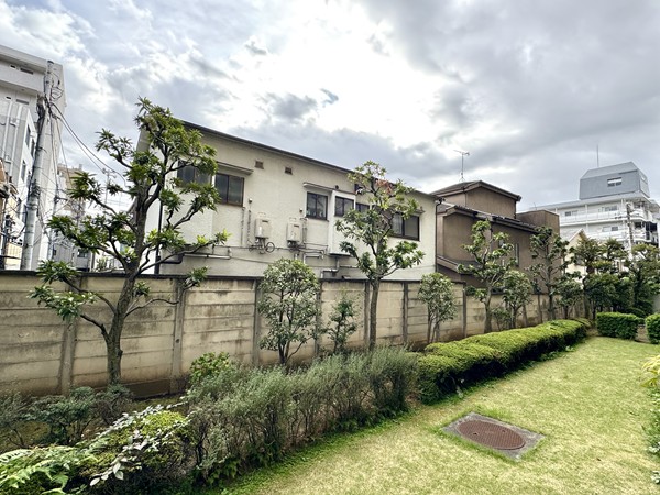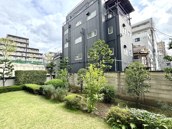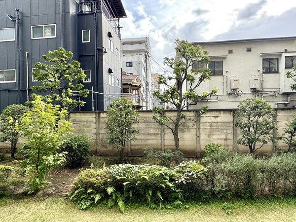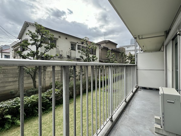 2部屋分の横幅があるゆったりとしたバルコニー。バルコニーの外側には手入れが行き届いた裏庭のようなスペースが広がり、爽やかなグリーンビューとなっています。塀があるため、通行人からの視線は気にせずに済みそうです。