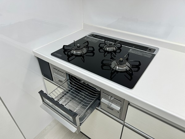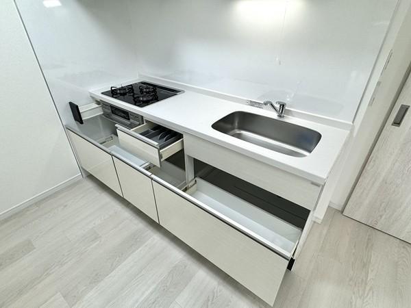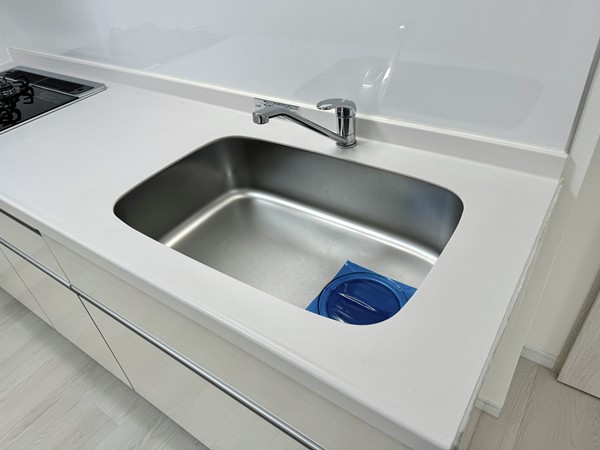 キッチンはお料理に集中しやすい壁付けのレイアウト。背面にはゆったりとスペースが確保されているので、冷蔵庫やカップボードを設置してもゆとりをもって家事をこなす事が出来るのではないでしょうか。