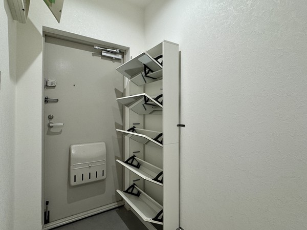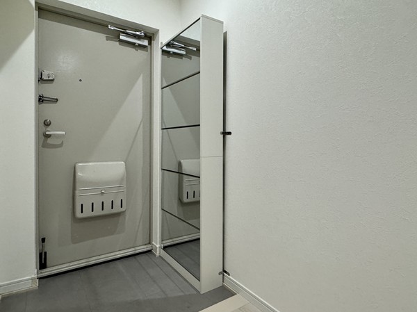 玄関には、空間を圧迫しないコンパクトな下駄箱が設けられています。キャビネットの扉が鏡になっており、空間を広々とみせると同時にお出かけ前の身だしなみチェックにも大活躍です✧