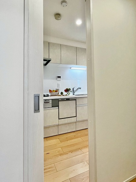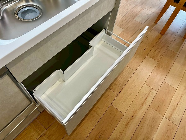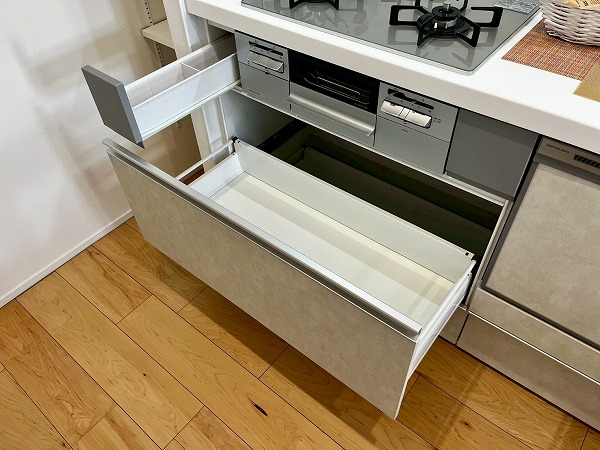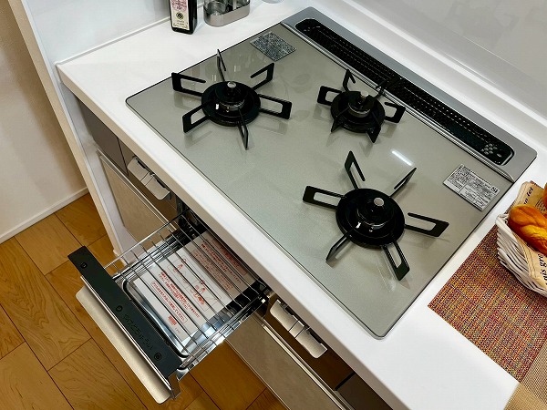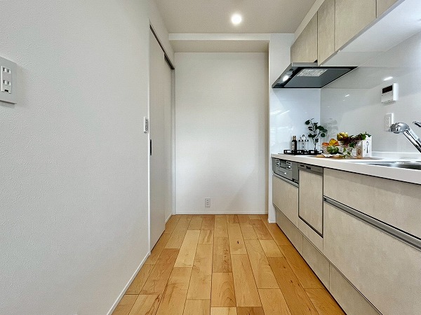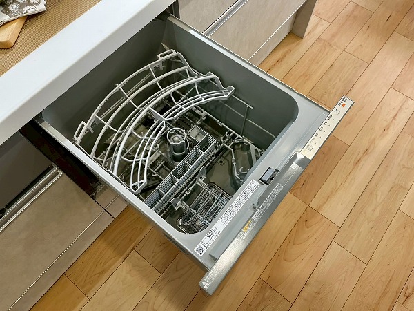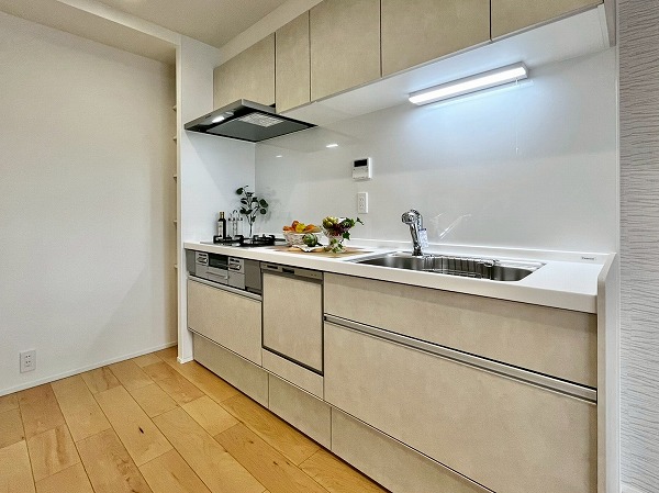システムキッチンは3口コンロや大容量の収納スペースを完備し、使いやすさに配慮された造りがうれしいですね。キッチン周りにはゆとりがあり、近くで遊ぶお子様の様子をうかがいながら料理できて安心です。食洗機を使えば、面倒な家事の時間も趣味の時間に早変わり✧
