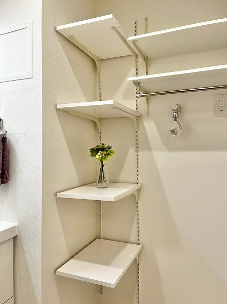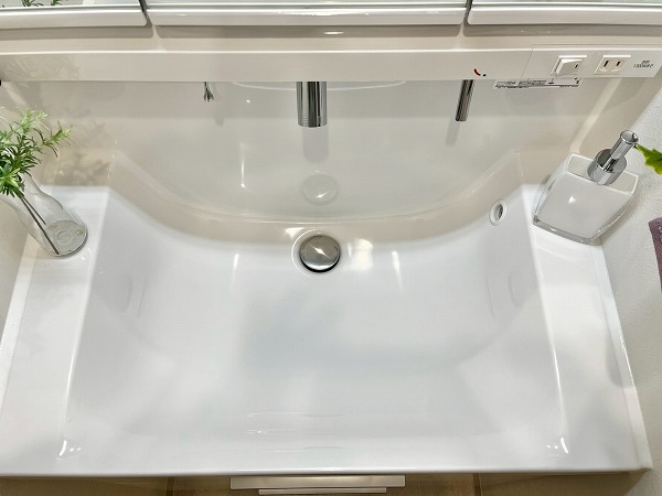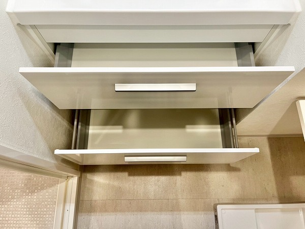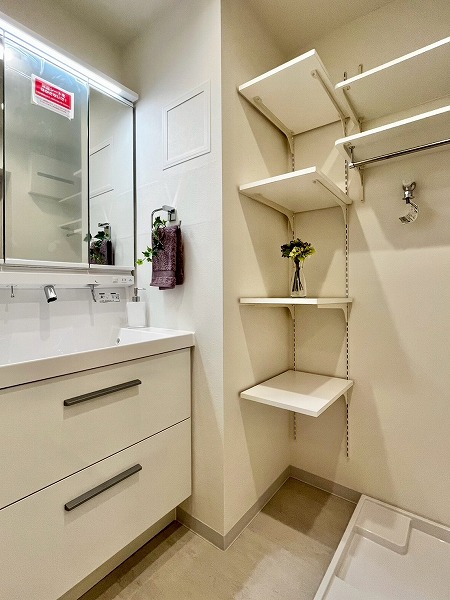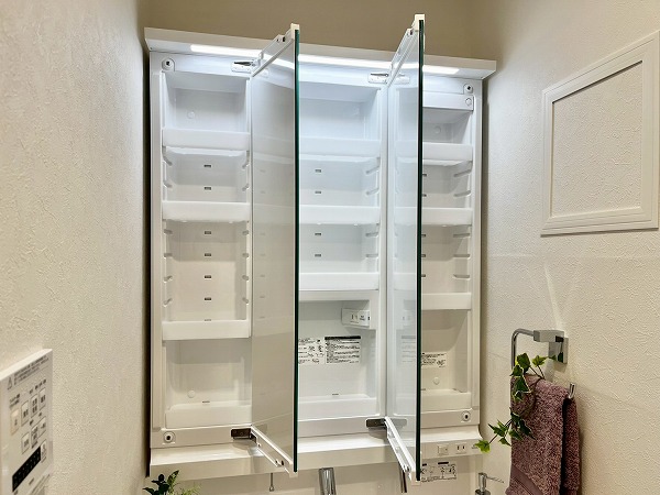 収納が多く設けられたパウダールーム。タオル類をまとめて置いておけば、入浴や洗顔の後にすぐ使うことができます。ごちゃつきがちなお風呂周りのグッズは鏡裏や洗面台下にしまえば、いつでも綺麗な状態をキープ✧