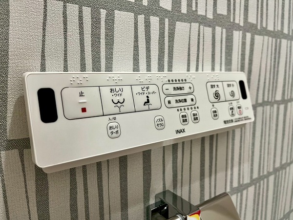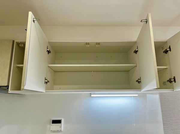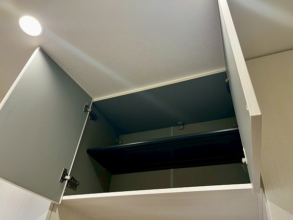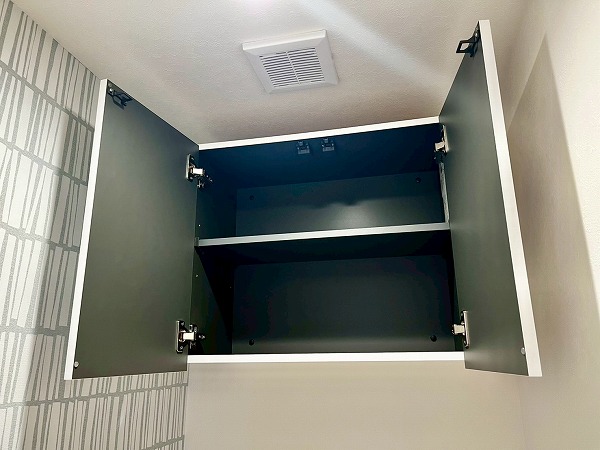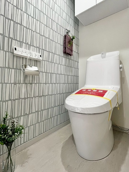 アクセントクロスが採用され、明るく清潔なトイレ。トイレットペーパーやお掃除用品の収納に丁度いいシェルフが上部に設置されています。扉が付いているので、見せたくないものはしっかりと隠し、すっきりとした空間に。