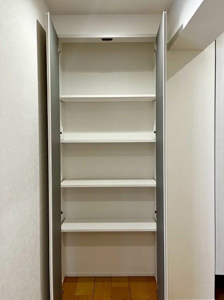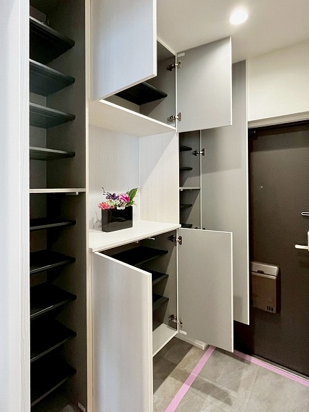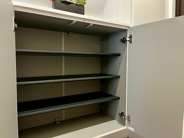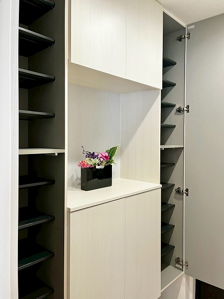 玄関に取り付けられたシューズボックスは、中央のニッチ棚を囲むように設けられ、4人分の靴も十分に収納可能な大容量。普段は使わないよそ行きのお履き物のほか、レジャーシートやお子様のおもちゃなども余裕で入りそうです。