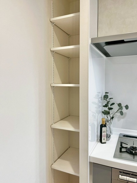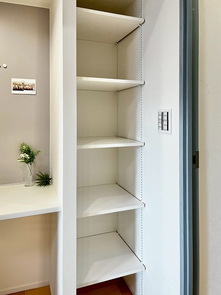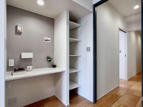 メインルーム内に、シェルフを兼ね備えたカウンタースペースがありました。共有スペースにして趣味の物を飾りつけすれば、家族の会話も弾むこと間違いなし♪チェアを置けば、ちょっとした作業スペースとしても多機能にお使いいただけます。