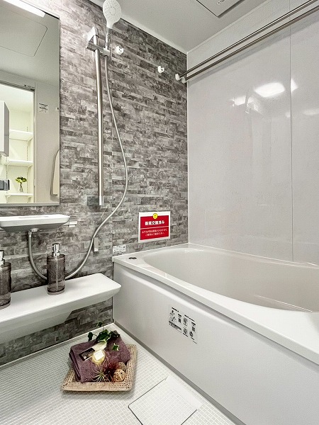 ホテルライクなアクセントパネルが採用された、上質な雰囲気漂うバスルーム。毎日気分が上がるお風呂タイムになりそうですね♪浴室乾燥機能付きなので、雨の日や夜のお洗濯物にも対応◎追い焚き機能を使えば、それぞれのタイミングに合わせて快適に入浴していただけます。