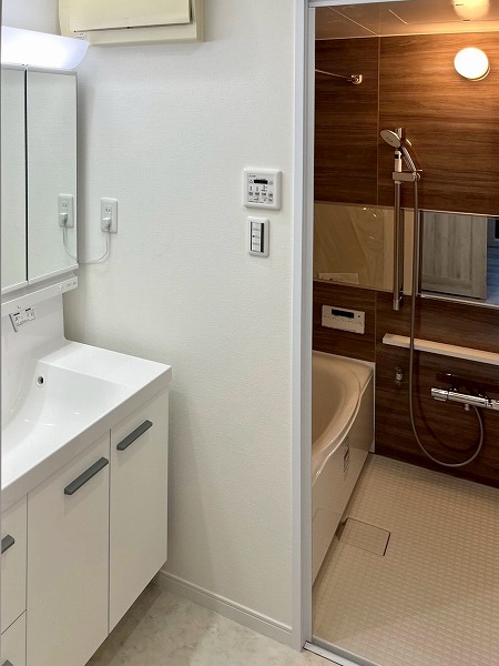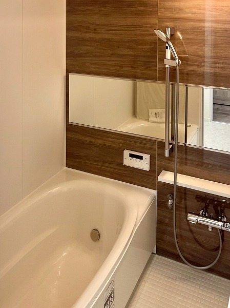 バスルームにはブラウンの木目調パネルを採用し、落ち着いた雰囲気に。ワイドミラーが空間に奥行きを与え、浴室全体を広く見せてくれます。浴槽には追い炊き機能を完備しており、ワンタッチでお湯を温め直すことが可能。半身浴を楽しみたい方にも嬉しい仕様です♪