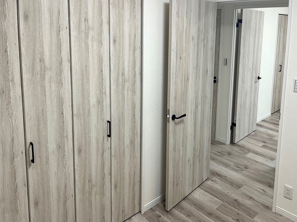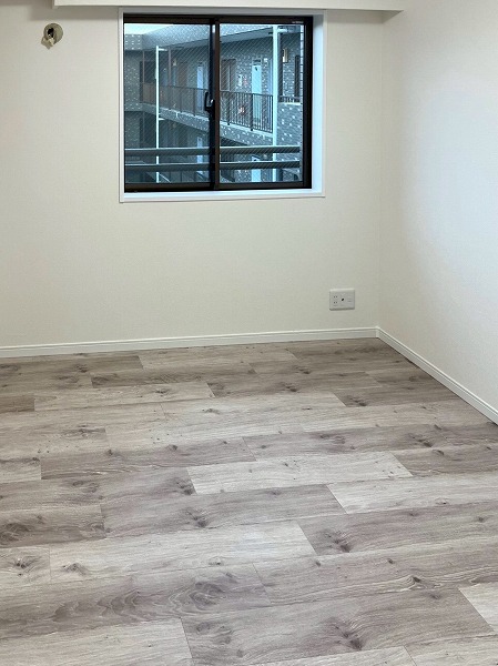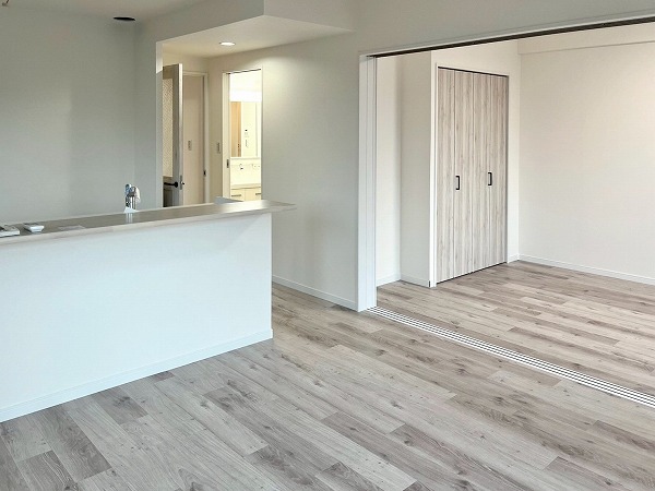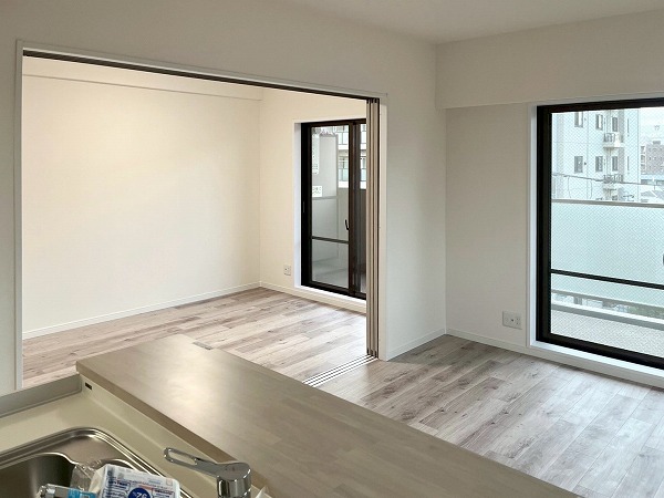メインルームに隣接するのは、約6.0帖の洋室。北向きの大きな掃き出し窓からはバルコニーへ直接出入りが可能です。スライドドアで仕切られており、開放すれば空間がつながり広々とした開放感を楽しめます。