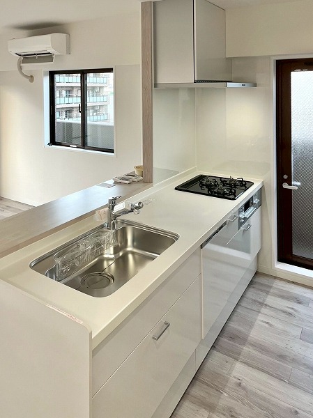 キッチンは、ご家族との会話を楽しみながら調理ができる対面タイプ。ホワイト基調のデザインで室内と自然に調和します。シンクやワークトップはゆったりとした広さがあり、グリル付き3口コンロと料理が好きな方に嬉しい造り。さらに食洗機も備え付けられており、忙しい日々の家事をしっかりサポートしてくれますよ◎