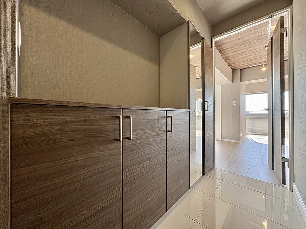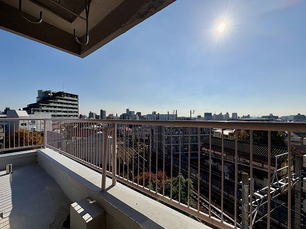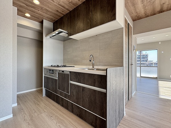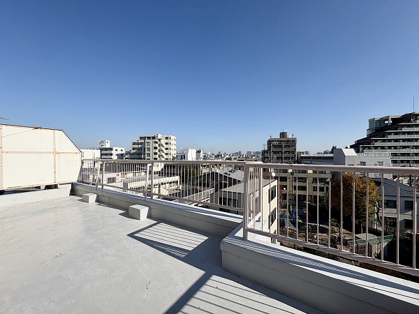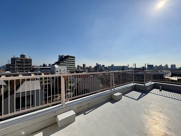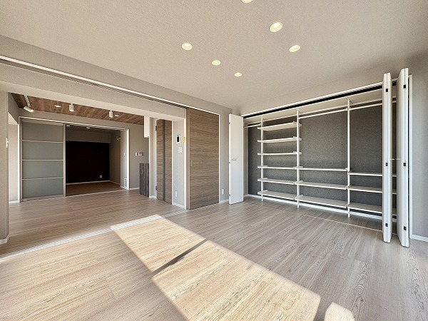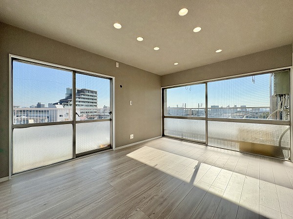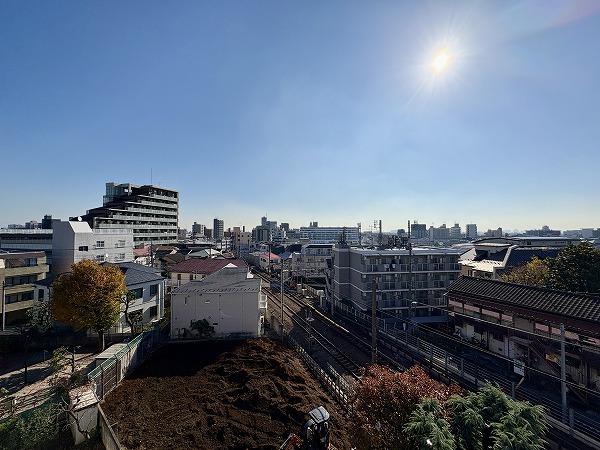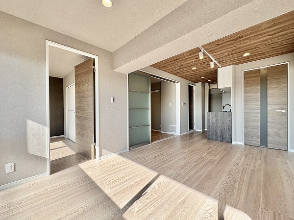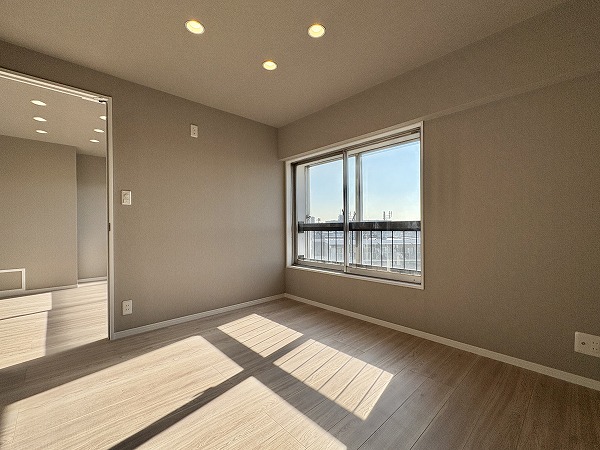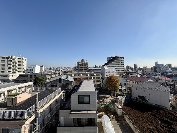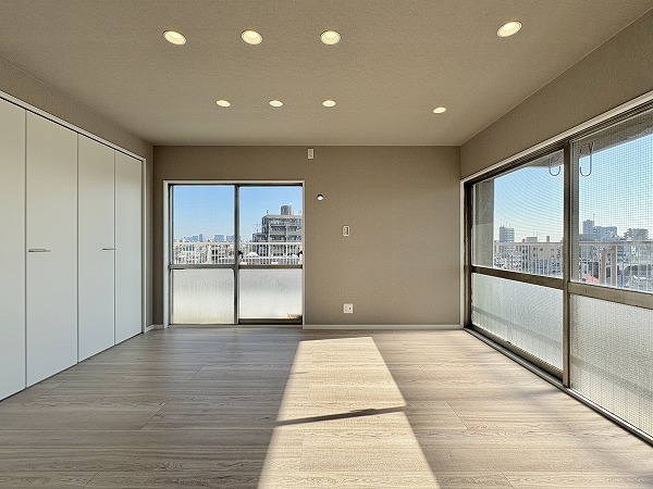 こちらは北千束駅から徒歩3分、『北千束スカイマンション』の5階に位置するお部屋です。ルーフバルコニー付きの南東角部屋で、何といっても陽当たりの良さが魅力的☀サッシのサイズが非常に大きく、燦々と陽が降り注ぎます。今回は冬の初めの快晴日にお邪魔したのですが、少し暑く感じるほど室内が暖かかったのが印象的でした。夏場は室内が暑くなりそうなので、遮光性の高いカーテンやエアコンなどを活用して対策していただくことをオススメします。また、開放感あふれるレイアウトも特徴のひとつ。全ての洋室、設備がリビングダイニングに面しており、扉を開けておくとかなり広々とした空間です。扉の開閉でお手軽に空間を仕切ることができるため、来客時もストレスがありません。木目天井を取り入れたお洒落な内装や、大きな収納設備も良いなと思いました◎ぜひ一度現地でご覧ください♪ ライター:yuki【25K28】