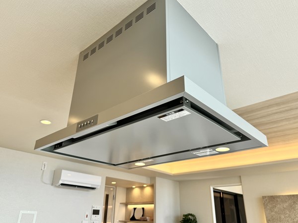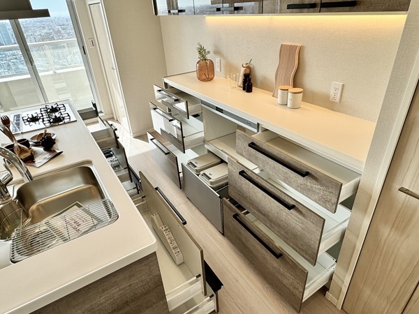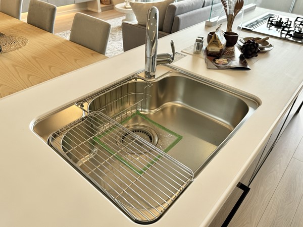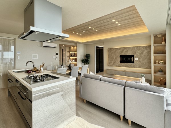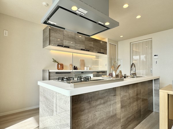 ゆったりとしたアイランドキッチンも魅力的なポイント。背面には大きなカップボードや扉付きの収納があり、調理器具や食器のしまい場所には困りません◎