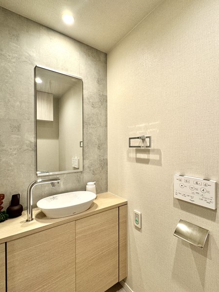 バスルームは落ち着いたブラウンの壁に包まれた癒し空間です。横幅の広い鏡が取り入れられているおかげで空間に奥行きが出て、実際の広さよりもゆったりと感じられました◎