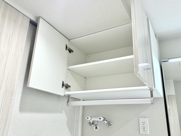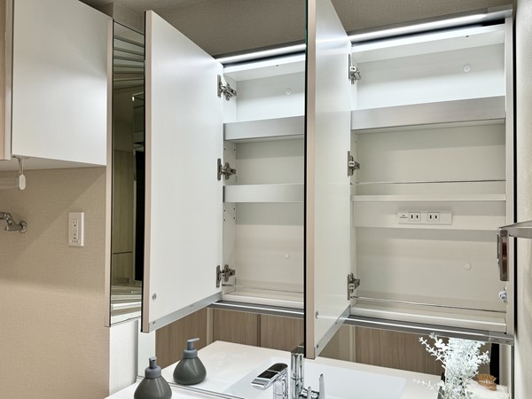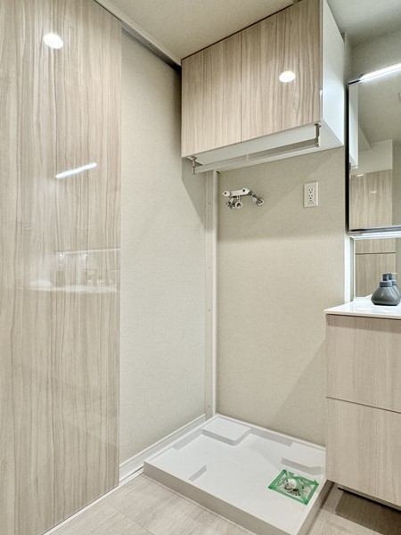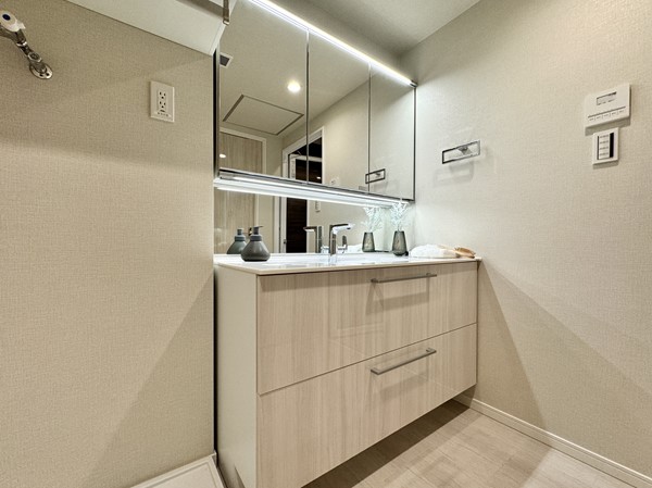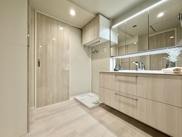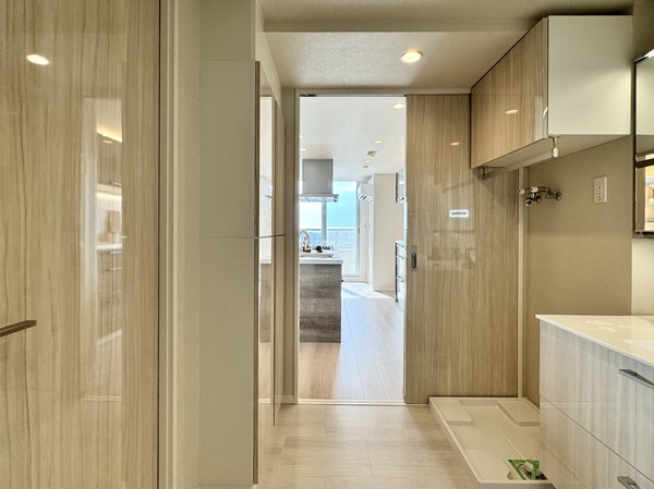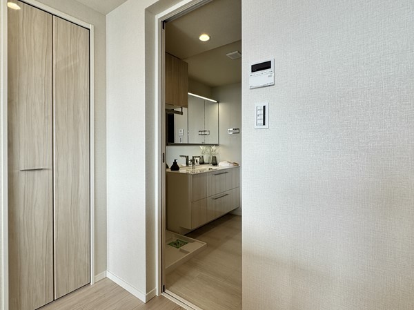 ゆったりとした洗面室は温かみのあるオフホワイトが基調になった清潔感ある空間に。廊下とキッチンの2ヶ所に入口があり効率の良い生活動線が確保されています。