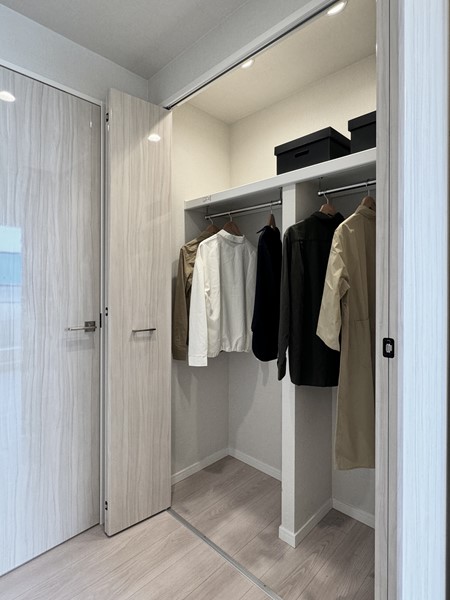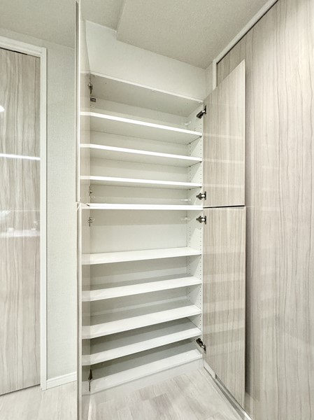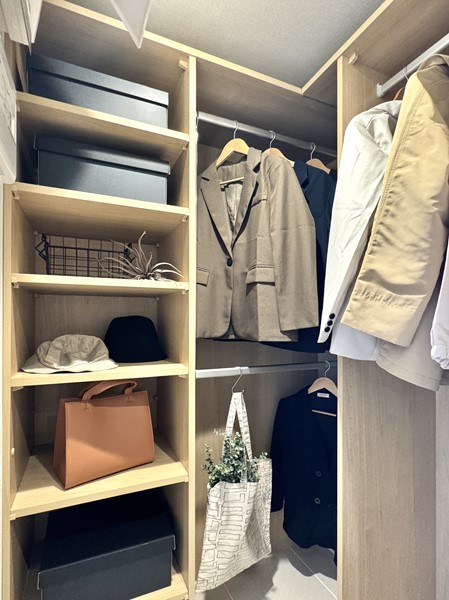 玄関には収納力抜群のシューズインクローゼットとマルチウォークインクローゼットが設けられていました。全体的に収納が豊富に取り入れられており、開放感を保ちつつ空間を無駄なく活用できるように配慮された間取りです。