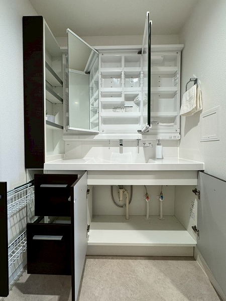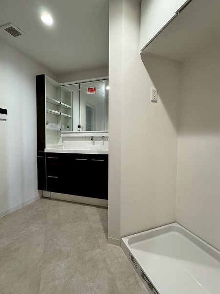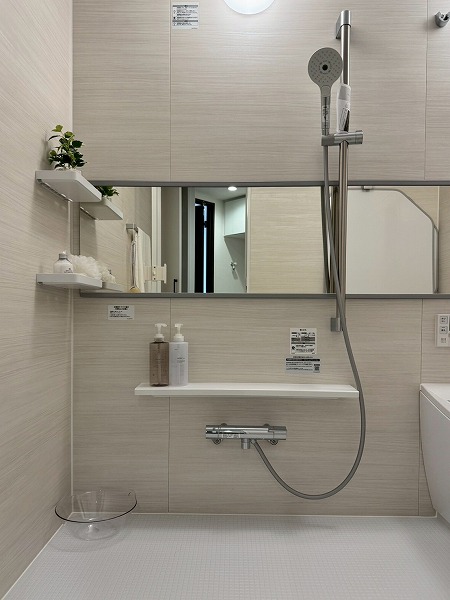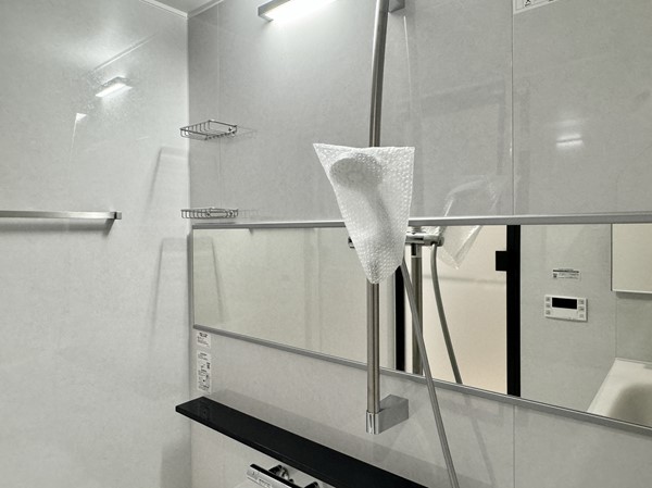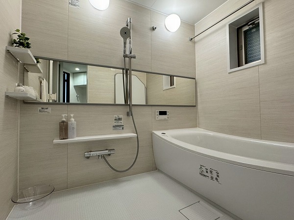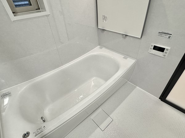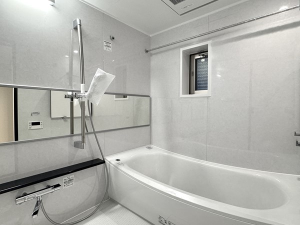 バスルームは洗い場が広々しています。追い焚き機能付きで最後にご入浴される方まで温かい湯船に浸かることができますよ。換気・乾燥・暖房付きなので、天候を気にすることなくお風呂場で部屋干しができるのも嬉しいポイントですね。