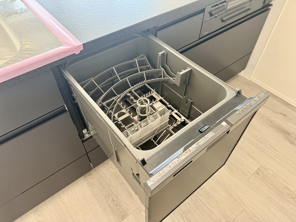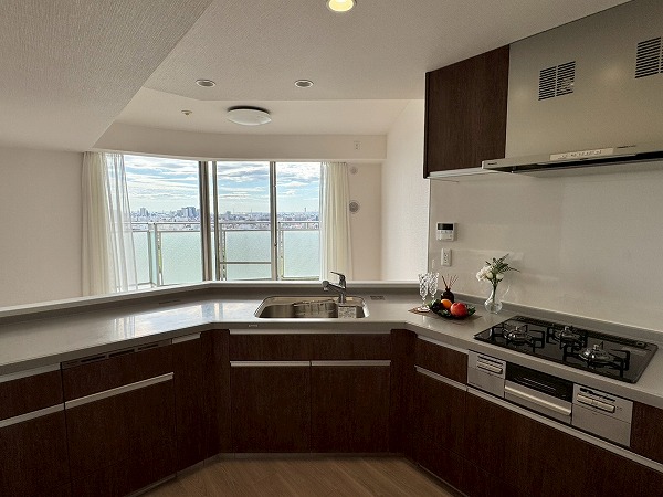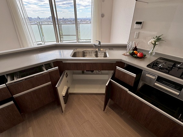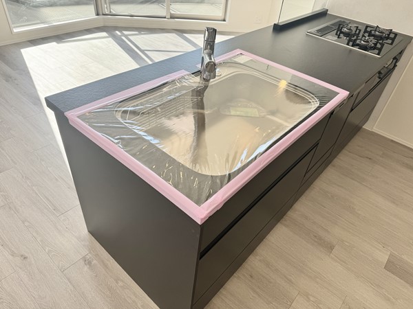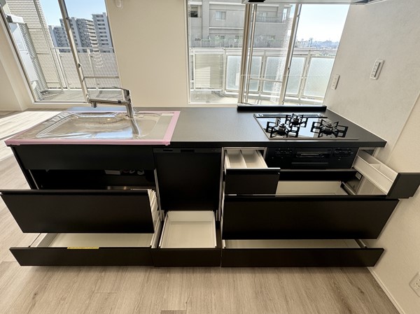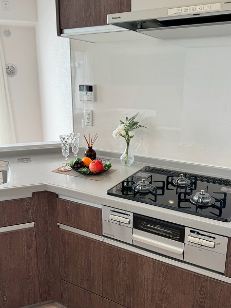 広々としたオープンキッチンには、食洗機とグリル付き3口コンロ付。収納や調理スペースが十分にあり、ご家族で一緒にお料理が楽しめそうでした。キッチンからの景色も開けていてスッキリとした印象です。