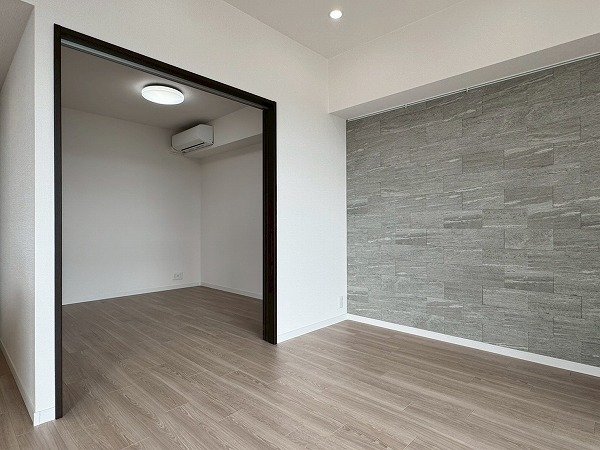 約19.7帖のメインルームは家族誘ってゆったりと過ごすことができる十分な広さです。すぐ隣の洋室のドアを開けると、さらに奥行きを感じる事ができます。大きな窓からはたくさんの光が入り明るい印象です。グレーのレンガ風のアクセントクロスがポイントになっていますね。