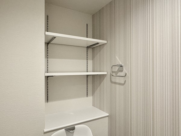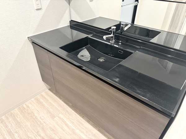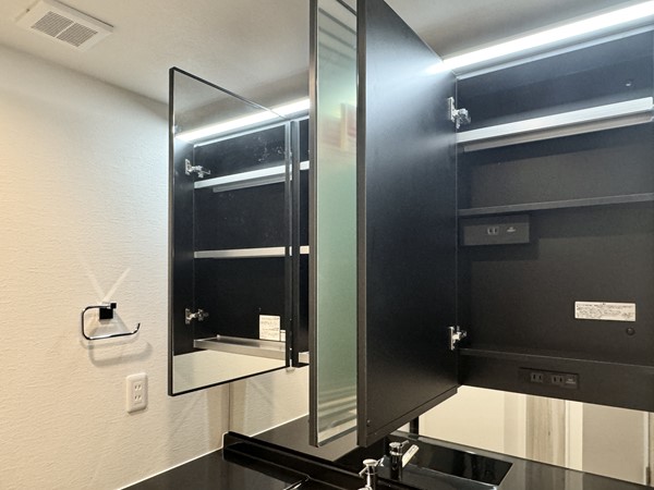 清潔感あふれるホワイト基調のパウダールームには、大きな3面鏡の洗面化粧台が存在感を放ちます。右側には洗濯機置き場とリネン庫を完備し、バスルームとも一体化。生活動線が整っているだけでなくインテリアとしても美しく、毎日の家事や身支度がより心地よくなる空間に♥