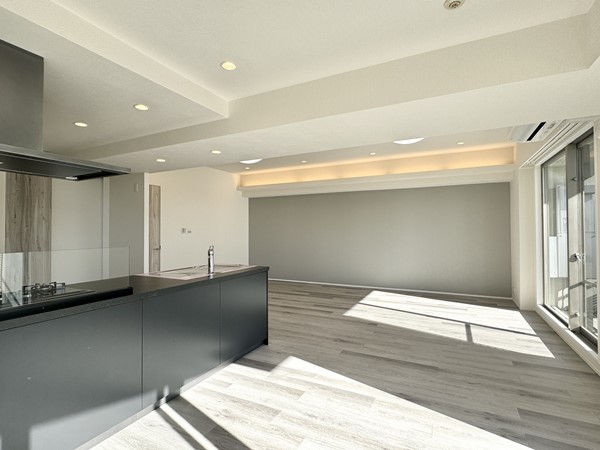 メインのリビングダイニングキッチンは約24.1帖と、とにかく広々!ホワイトの内装にコーニス照明がやさしく映え、明るく開放的な雰囲気です。ソファもダイニングも無理なく置けるため、家具選びが楽しくなりそうですね♥