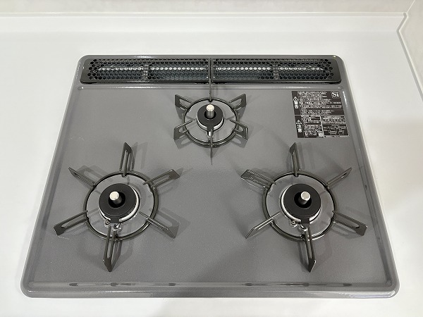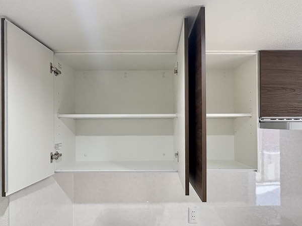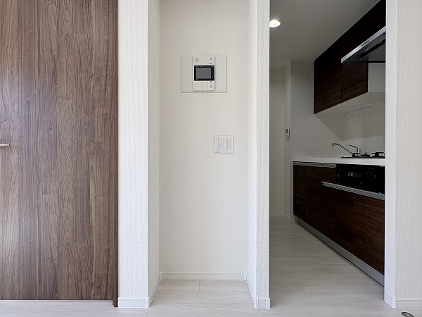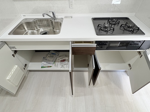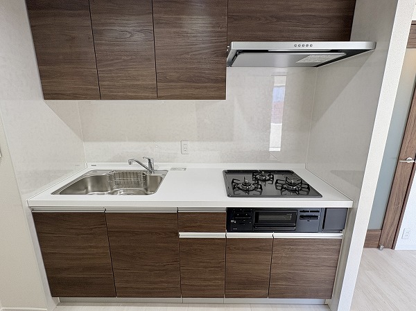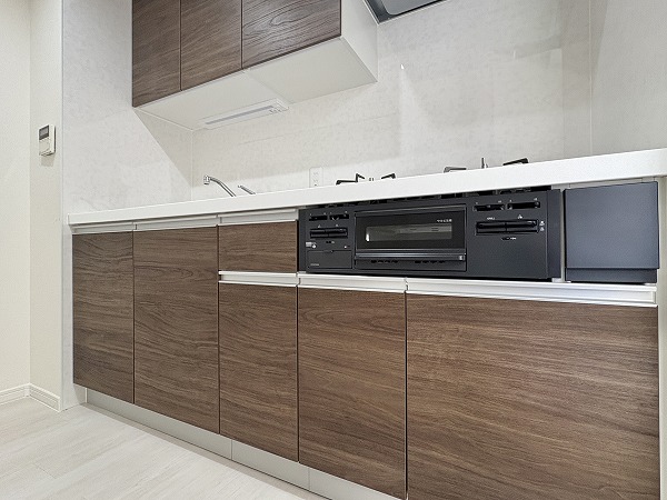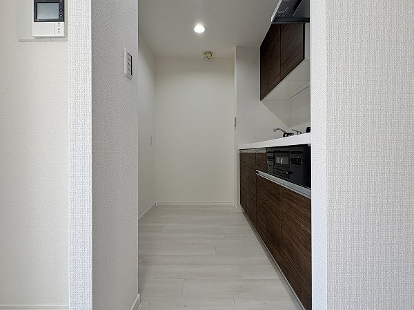 こちらがキッチンです。壁に挟まれたウォール型のキッチンで、料理がはかどること間違いなし。キッチン上下の収納は十分にあり、キッチン用品から食器類まで、丸ごと収納できます!冷蔵庫とそのほかのキッチン家電は、背面に設置しましょう◎