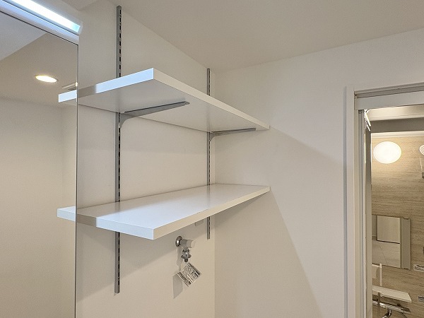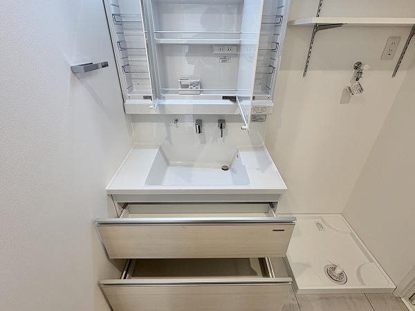 白を基調としたこちらのパウダールームは、清潔感があり気持ちが良いです✧ お掃除する際も、汚れている個所がわかりやすいので、楽々清掃していただけます!こまめにお掃除する習慣も自然と身に付きそうですね♩