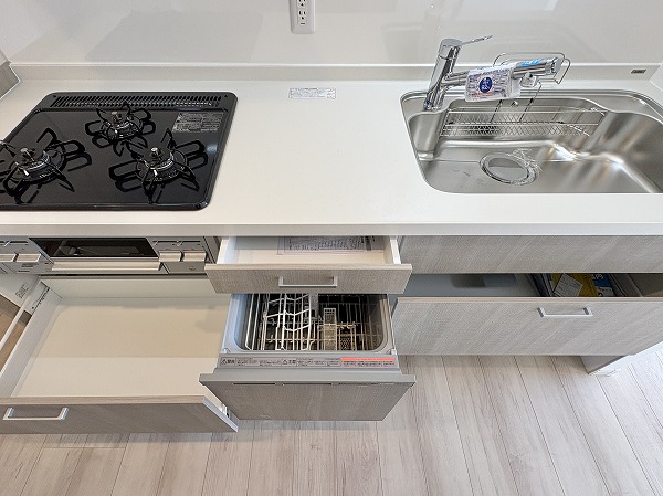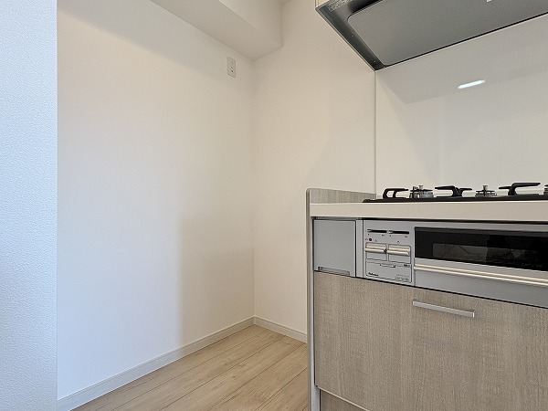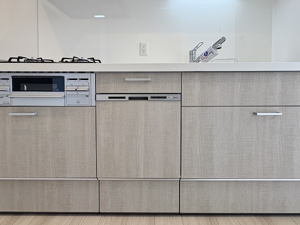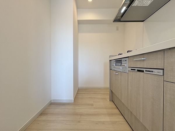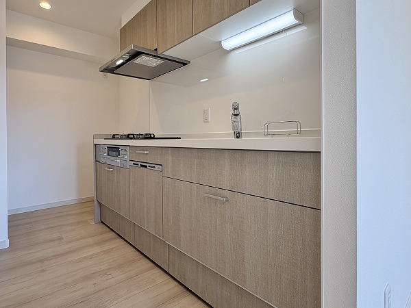 窓からの採光は、奥まった位置にあるキッチンにも届きます。キッチンはお料理に没頭することができるウォール型です。システムキッチンの上下には収納が付いており、スペースを圧迫せずに済みます◎