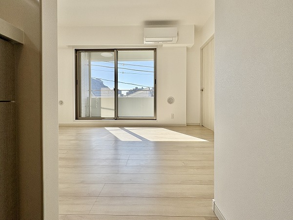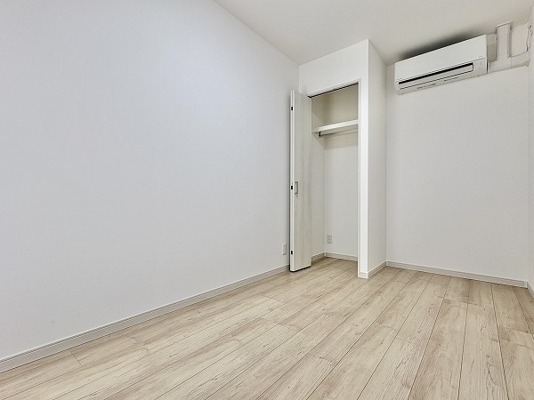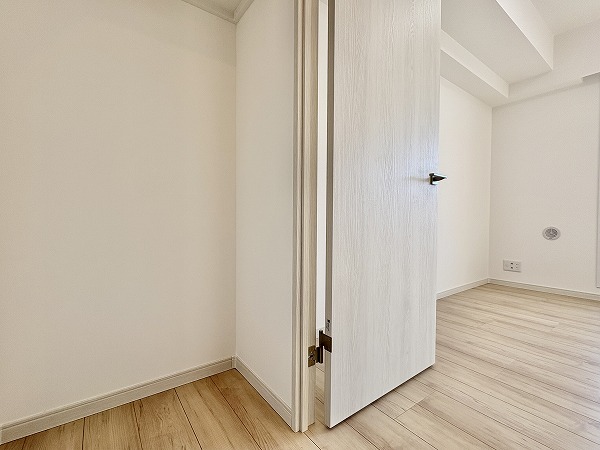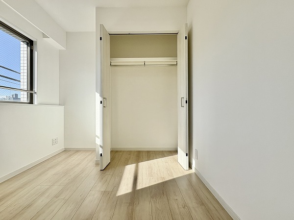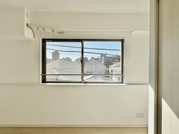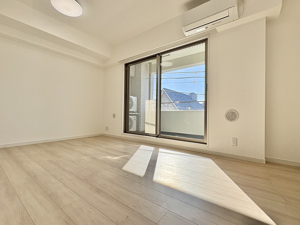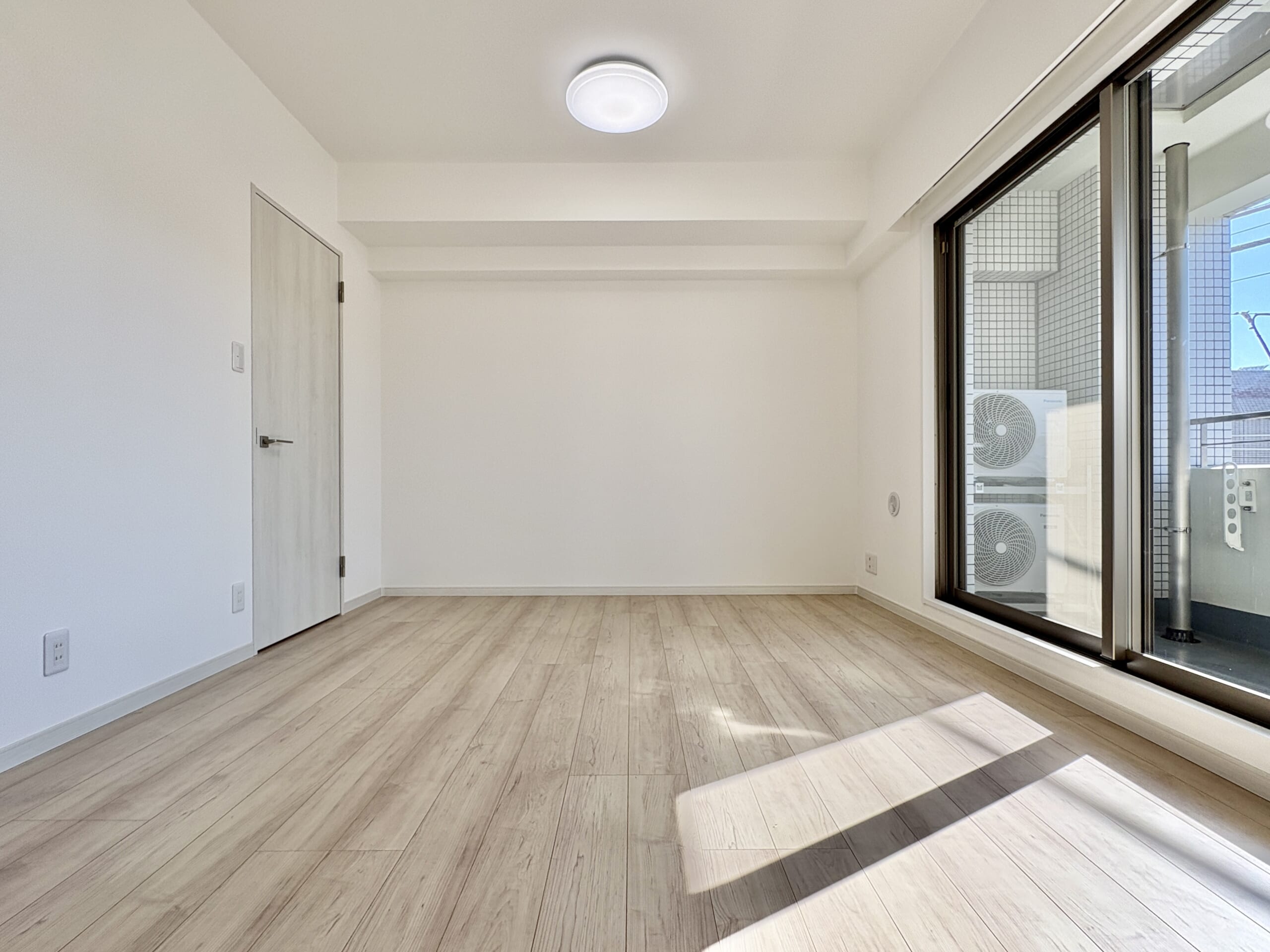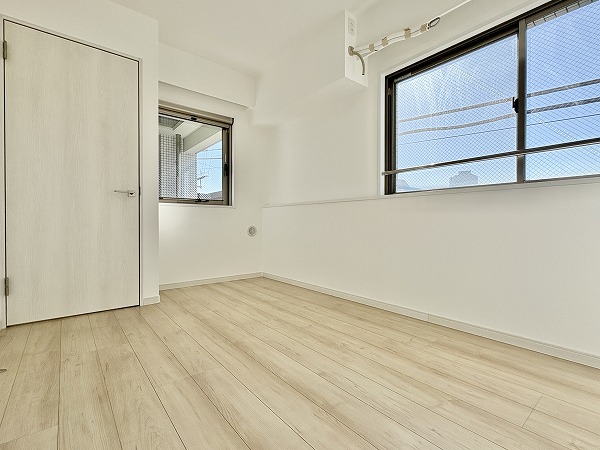 こちらは約5.8帖の洋室です。南西向きの窓と、バルコニー側の窓からの2面採光で、非常に明るいです◎日中は照明をつけなくても生活できるかもしれません...!縦長のお部屋なので、家具の配置を決めやすいのもうれしいポイントです♩