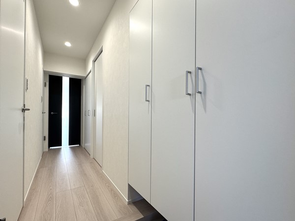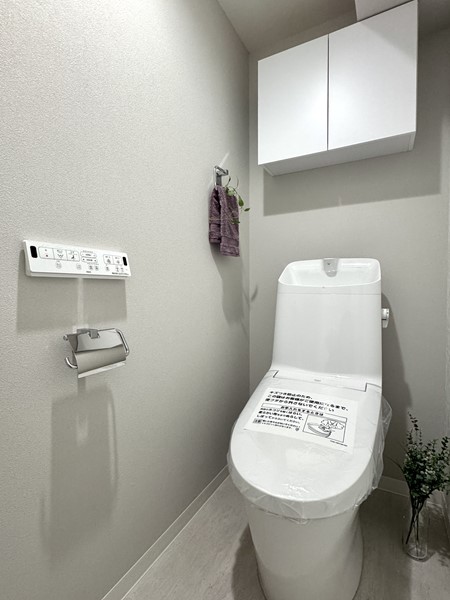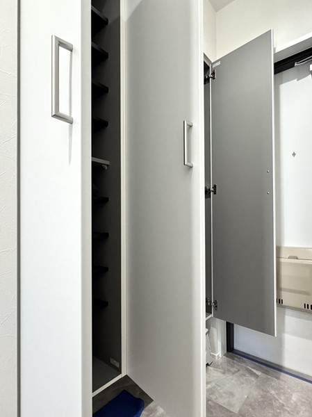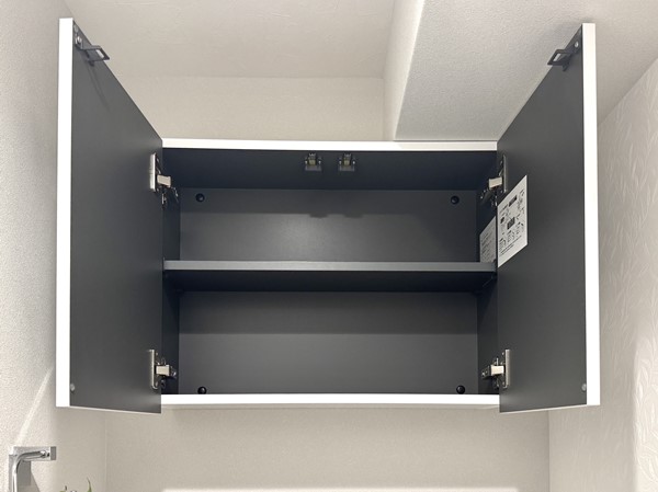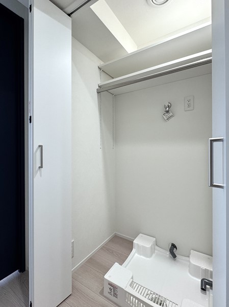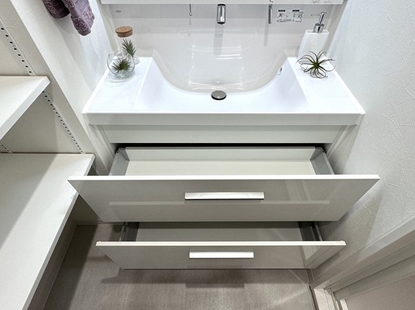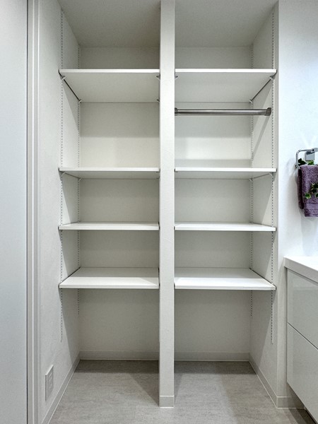 サニタリースペースには洗面化粧台に加え可動式の収納棚を設置。タオルや洗剤などをすっきりと整頓できます。バスルームを出てすぐ手の届く位置に収納があるため、床を濡らす心配も少なく使い勝手の良さが光ります✧
