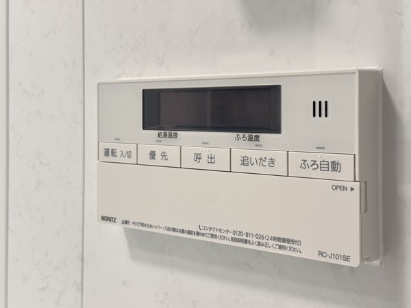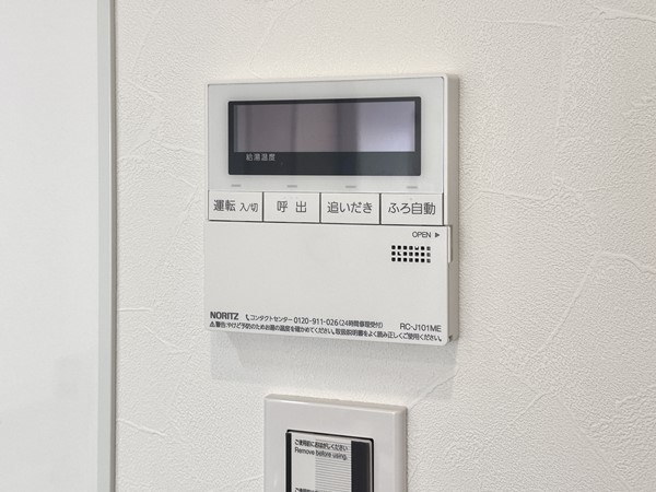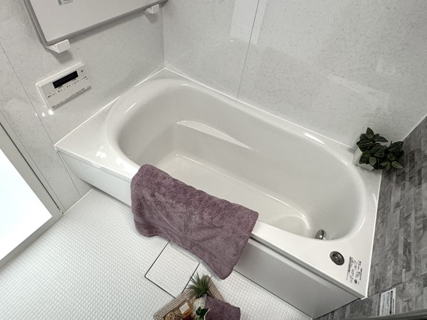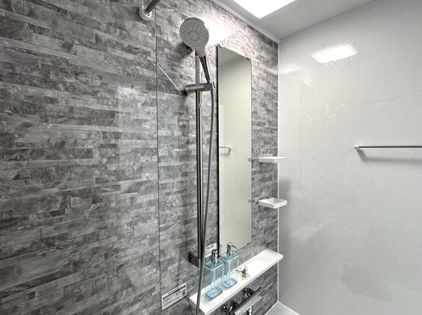 グレーのストーン調パネルを採用したバスルームは、落ち着きと高級感を感じさせる空間。洗い場にはカウンターが設置されており、シャンプー類をすっきり並べられます。もちろんバズタブには追い焚き機能を備えているので、快適なバスタイムをお楽しみください♪