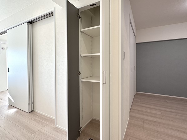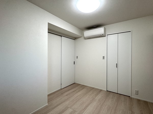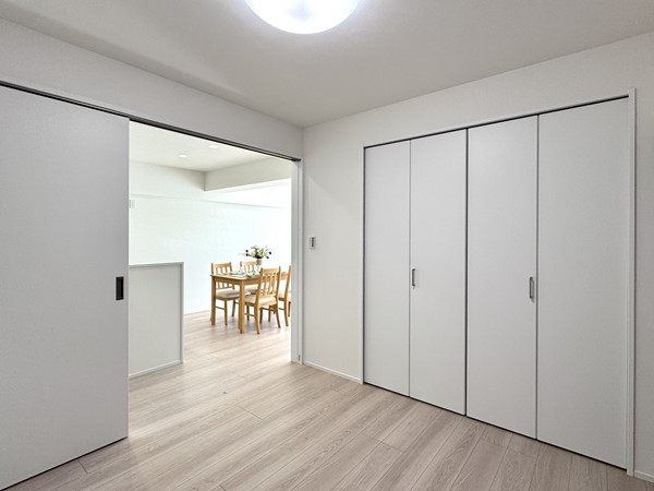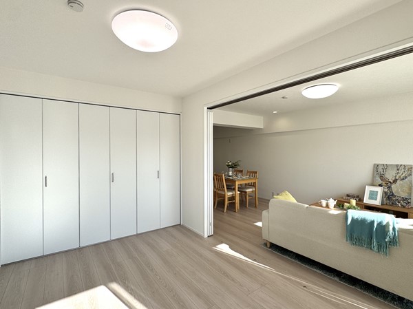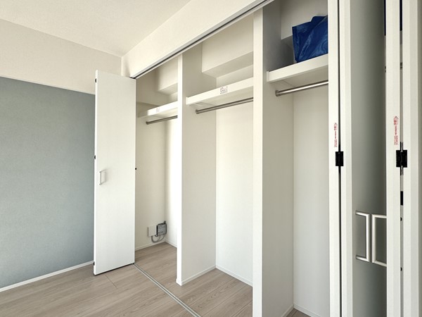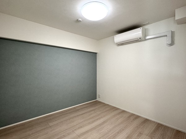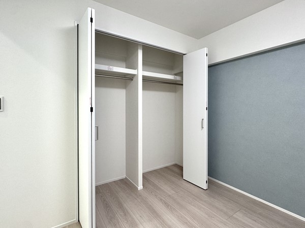 リビングとつながる約6.4帖の洋室は、グレーのアクセントがほどよい落ち着きを演出。派手すぎず長く使っても飽きのこないデザインです。収納力のあるクローゼット付きで、身の回りの物をまとめて収められるのも嬉しいポイント。