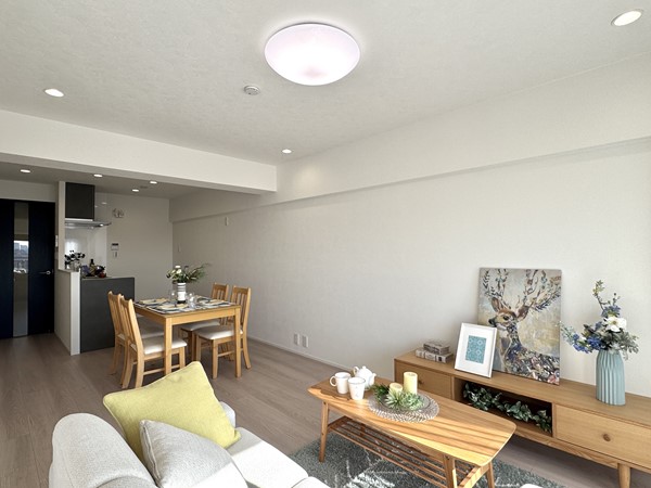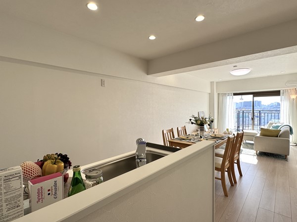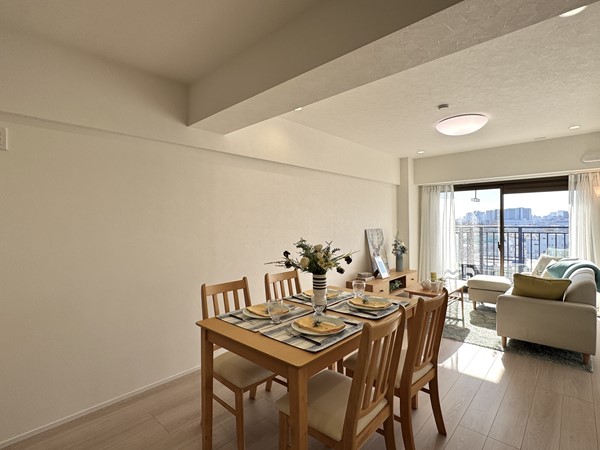 約13.4帖のメインルームは、リノベーションにより新築同様の美しい内装へと一新。縦長の造りを活かし、ダイニングスペースとリビングスペースを自然にゾーン分けできます。南向きの大きな掃き出し窓からはたっぷりと陽光が入り、明るく開放感のある空間が広がっていました。