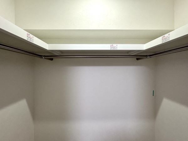 ウォークインクローゼットは、衣類を美しく保管できる設計。ハンガーパイプが3面に配置されているため、季節ごとの洋服も見渡しやすく整理できます。枕棚にはバッグや小物をまとめて収納でき、日々の身支度もスムーズになりそう。