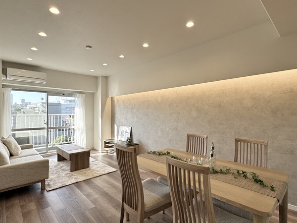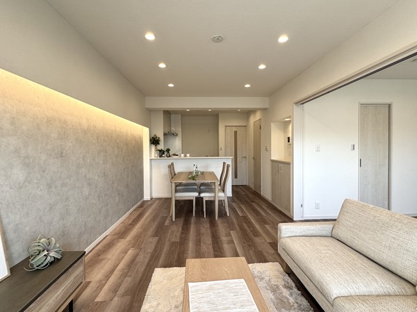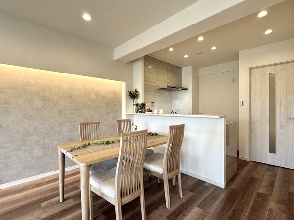 リビングダイニングキッチンは約11.8帖。アクセントウォールが目を惹く空間が魅力的♡家具があらかじめ揃っているため、引っ越したその日から家族やペットと共に日常を楽しめます。朝はダイニングで軽く食事を、夜はソファで寛ぐ…家具付きだからこそ叶う暮らしの余白と自由が感じられるお部屋です。