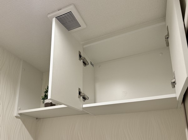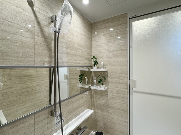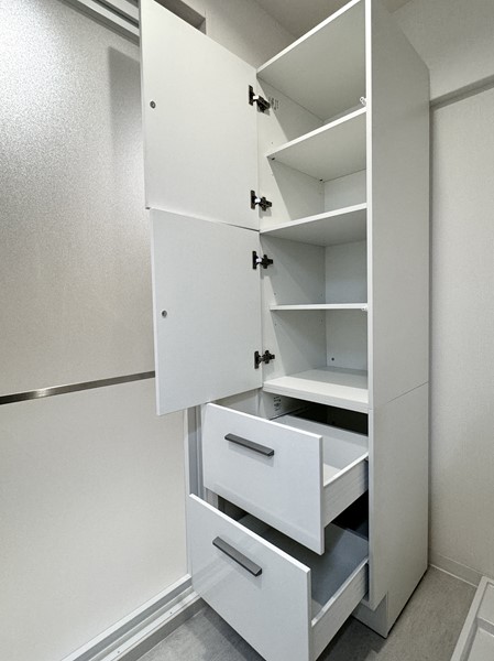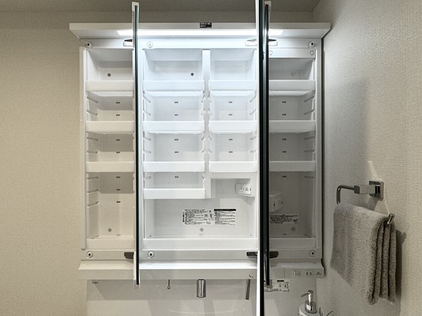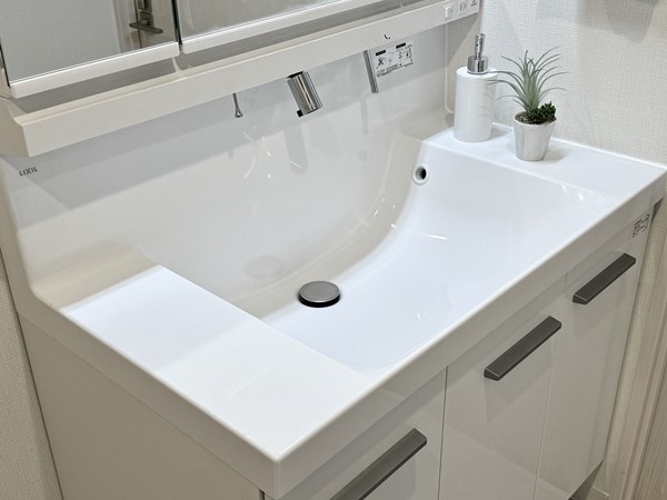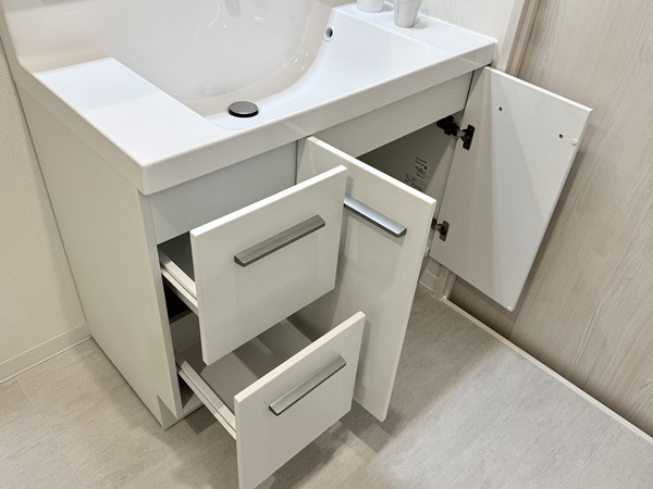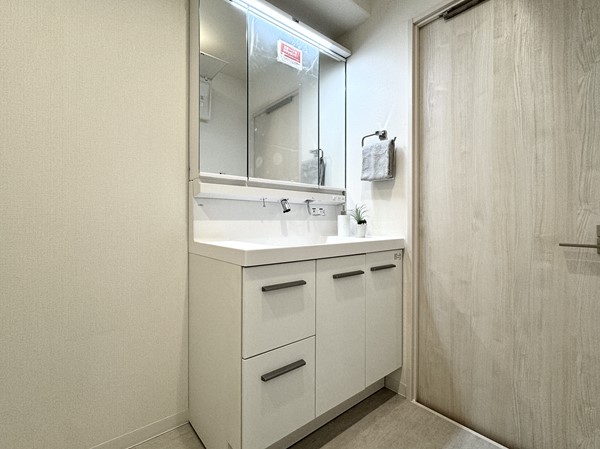 洗面化粧台、キャビネット、洗濯機置き場、バスルームが一体になったパウダールームは、ホワイト基調で明るく開放感のある空間。作業動線が整えられているため、朝の準備や洗濯、入浴までの流れがスムーズに行えます◎収納力も高く、タオルや洗剤なども美しく収まりますよ。
