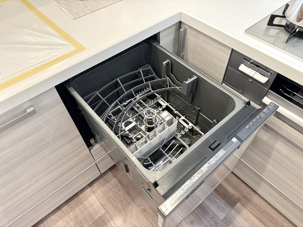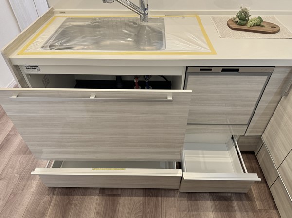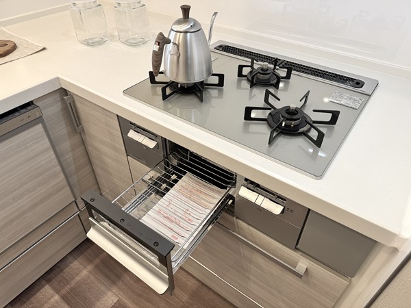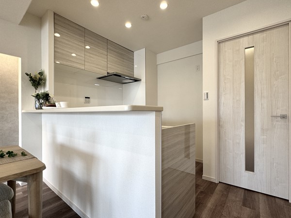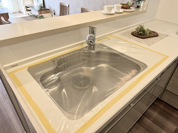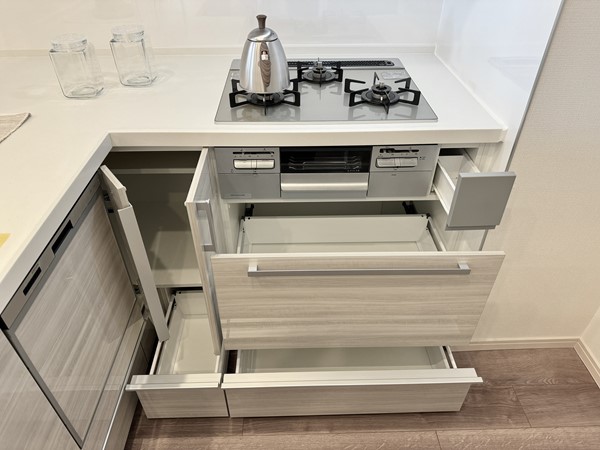 リビングとつながるL字型の対面キッチンは、料理をしながら家族やゲストと会話を楽しめる設計。収納も充実し、食器や調理器具をすっきりと整理できるのも魅力です。ダイニングセットが揃い、引っ越したその日から上質な暮らしが始められますよ♩