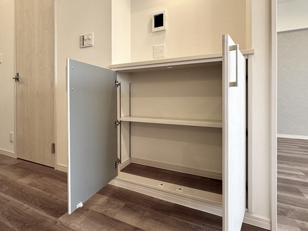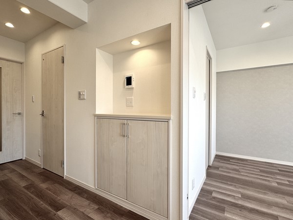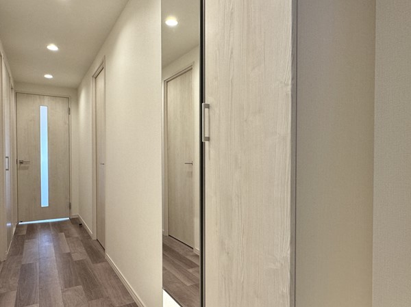 玄関にはアルコーブがあり、外からの視線や通行人を遮りつつ傘やバッグを一時的に置ける便利な空間に。姿見で出かける前のコーディネートを確認し、シューズボックスに靴を収納すれば、家族の動線も整い日常の支度がスムーズになりますね。