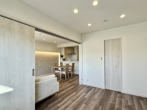 リビングダイニング横の約6.5帖洋室はスライドドアで仕切られ、開放すればワンルームのような広がりを演出。フレキシブルな間取りは、家族の団らん、趣味や書斎、ゲストルームなど多彩に活用できる贅沢な設計。閉めれば静かな個室としても使え、生活のメリハリを自在に楽しめますね。