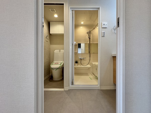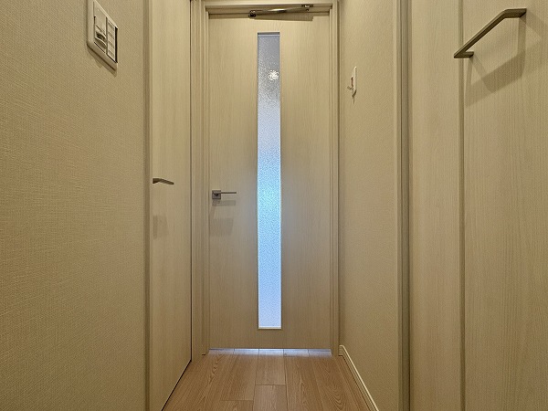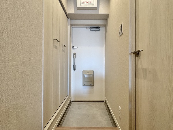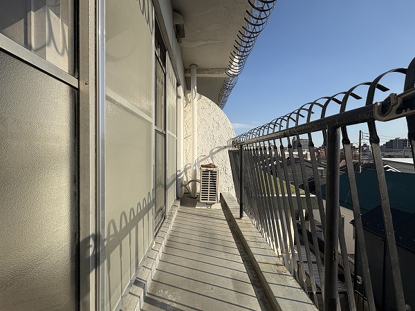 共用廊下は屋内の部分と屋外の部分があります。エレベーターに近いお部屋の場合は完全な内廊下。外廊下に面しているお部屋はちょうど階段の裏側に位置しているため、雨風は防げそうですね。