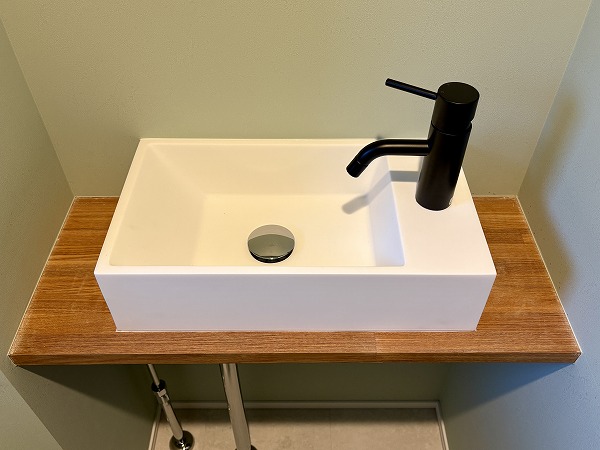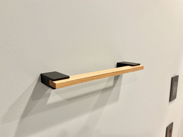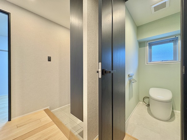 トイレには小窓が設けられ、自然換気ができる快適な環境。手洗いカウンターにはグリーンやアロマを置ける余白があり、木目デザインのタオル掛けなど、細部へのこだわりが上質なトイレスペースです。