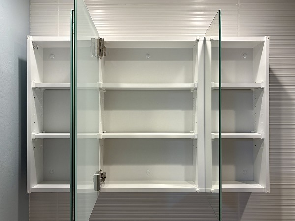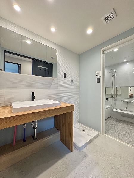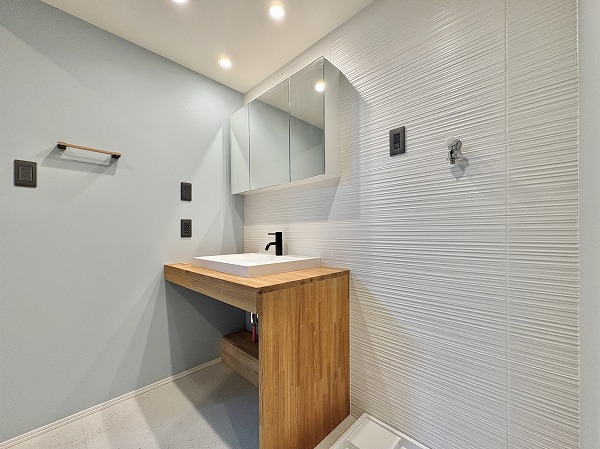 爽やかな白を基調としたサニタリーは、木目の洗面台がやわらかな雰囲気を添える心地よい空間。3面鏡の裏にたっぷりしまえるので、散らかりがちな水回りもすっきり✧朝の準備が少し楽しみになるようなデザインです。