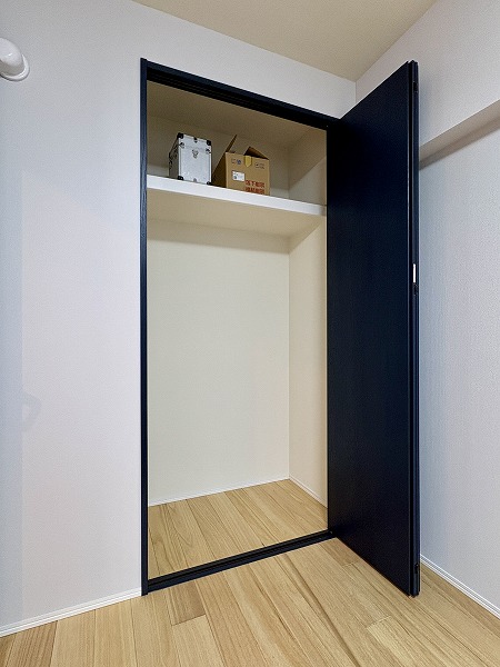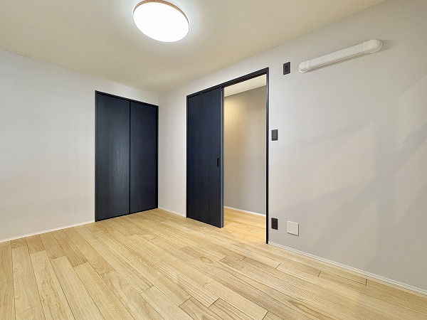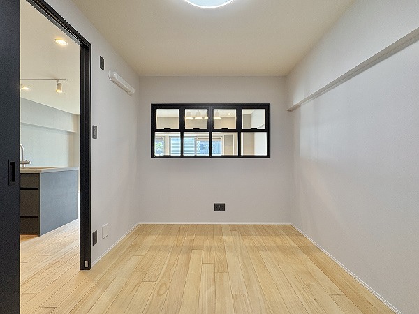 約5.2帖の洋室には、メインルームとつながる黒縁の室内窓を採用。空間に可愛らしいアクセントを添えていました♡クローゼットも完備し、デッドスペースのない形状でレイアウトの自由度が高いのも魅力。