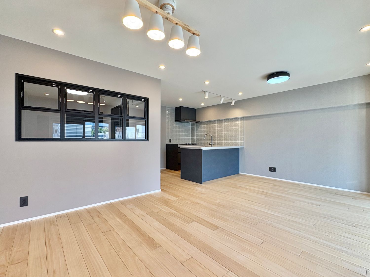 約15.5帖のメインルームには無垢材のフローリングを採用し、自然素材ならではの温もりと耐久性が抜群◎そこにライトグレーのクロスが上品なアクセントとなり、大きな窓が開放感を引き立てていました。
