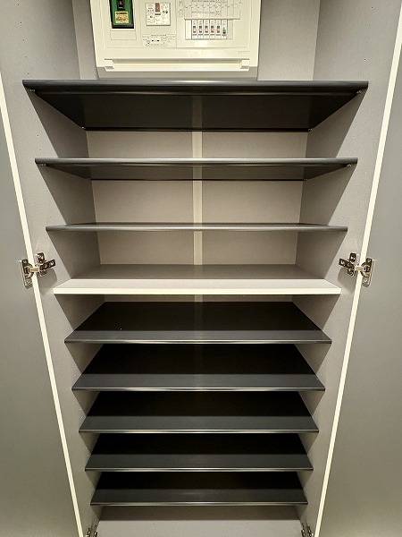 洗濯機置き場は扉付き仕様で生活感をさりげなく隠すことが。稼働音も軽減されるため、リビングで過ごす時間も快適。上部には棚が設置されているので、洗剤や柔軟剤をすぐ手に取れる位置に収納でき、家事効率の向上にもつながります。