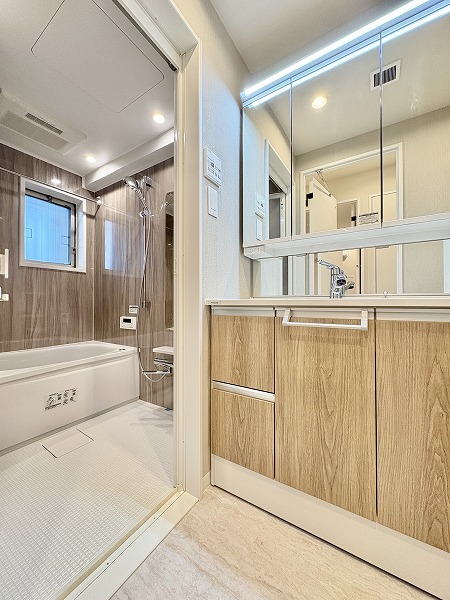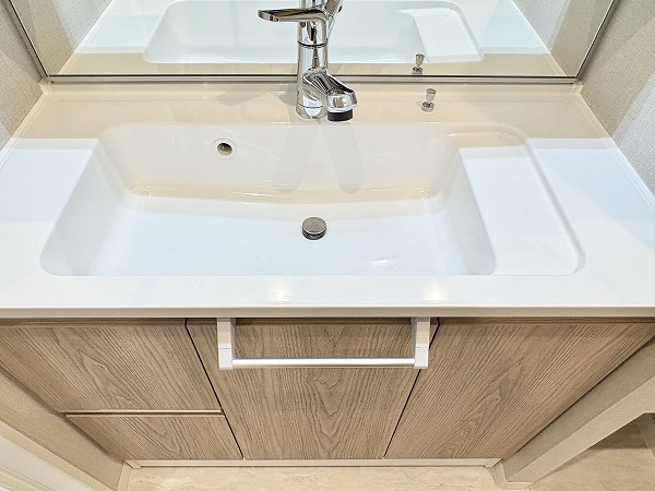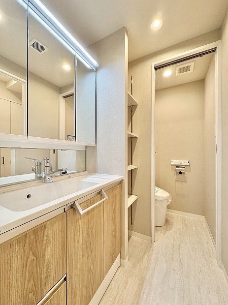 サニタリースペースには大きな洗面化粧台を設置。3面ミラー付きで身支度がスムーズに行え、忙しい朝の時間帯にも重宝しそう。キャビネット収納があるため、歯ブラシやスキンケア用品など細かなアイテムもすっきり収納可能です。さらにサイドには可動式棚があり、タオル類の収納にも便利◎