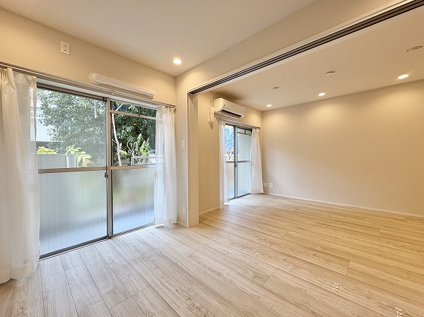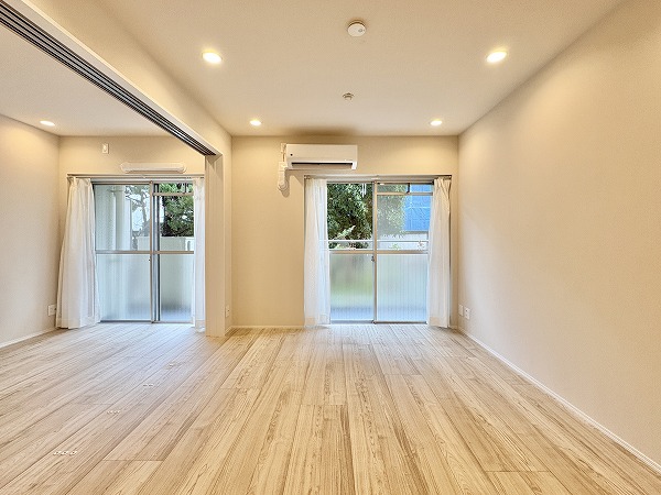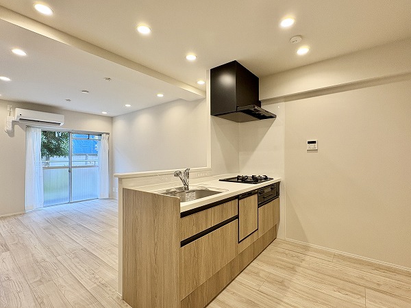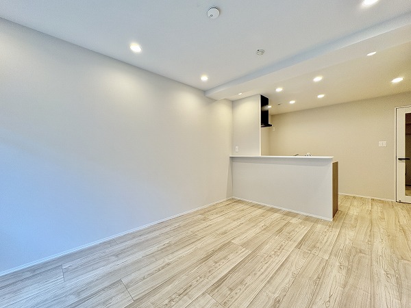 新規フルリノベーションが施された専有面積52.52㎡の2LDK住戸。カップルやご夫婦での暮らしにちょうど良いサイズ感で、日常に程よいゆとりをもたらしてくれます。室内は柔らかな木目調フローリングが足元から温もりを伝え、ホワイトクロスが空間全体を明るく爽やかに演出。アフターサービス保証付きという点も住み始めてからの安心材料です。