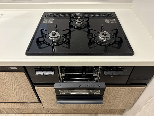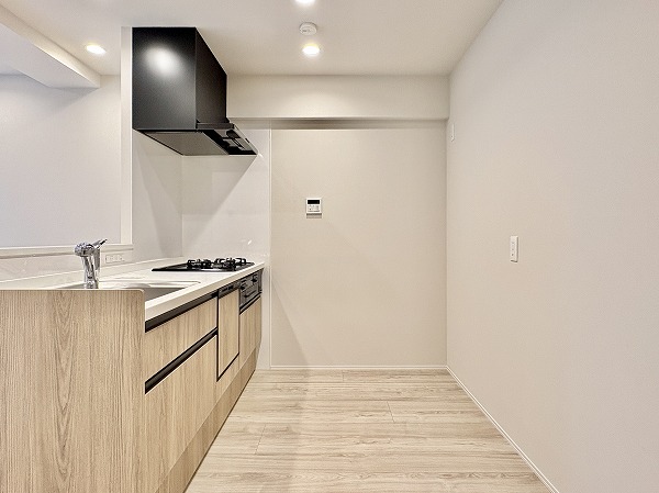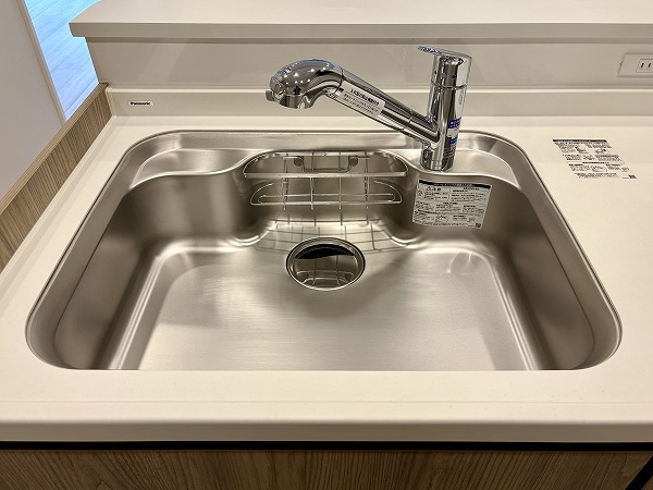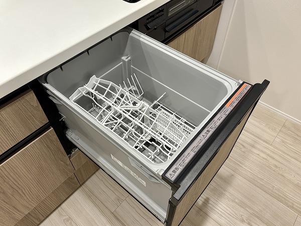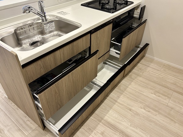 キッチンはリビングを見渡せる対面タイプを採用。配膳や片付けの動線がスムーズで、毎日の家事負担を軽減。調理をしながらご家族との会話を楽しめるのも嬉しいですよね。収納力も高く、調理器具や調味料をしっかりしまえる点に加え、食洗機付きで後片付けも快適に。