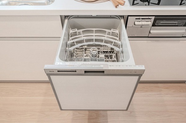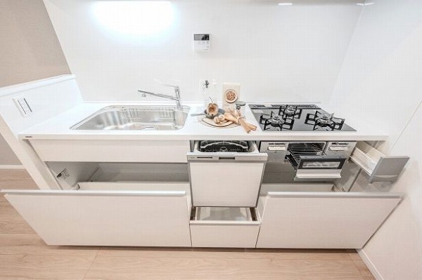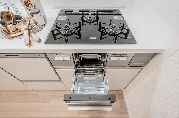 キッチンは室内の奥に配置され、ほどよい独立性を確保。来客時にも生活感が目に入りにくい点は嬉しいポイントです。収納スペースが充実しており、食器や調理器具もすっきり収まります。食洗機やグリル付きコンロを備え、調理から後片付けまで快適にこなせそう。